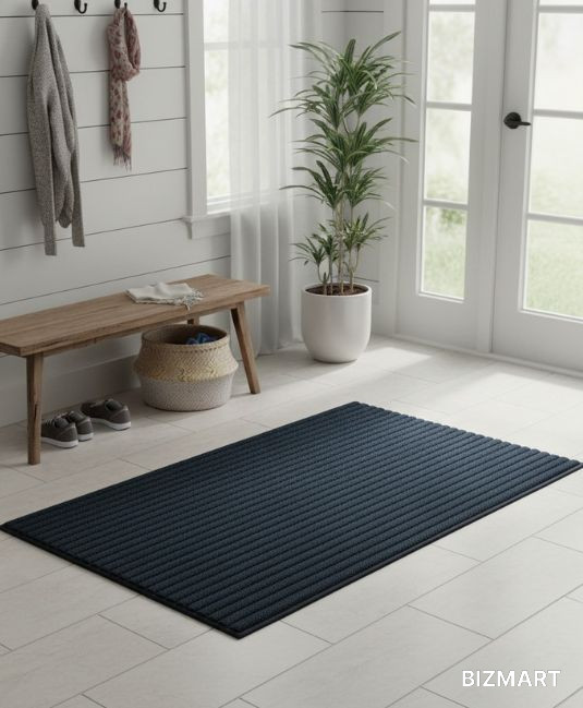 Практичный коврик для ванной комнаты с ребристой поверхностью обеспечивает комфорт и безопасность после душа. Мягкий материал быстро впитывает влагу и предотвращает скольжение, сохраняя пол сухим и чистым.