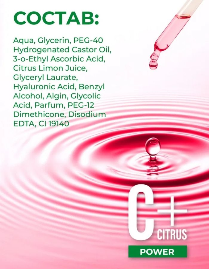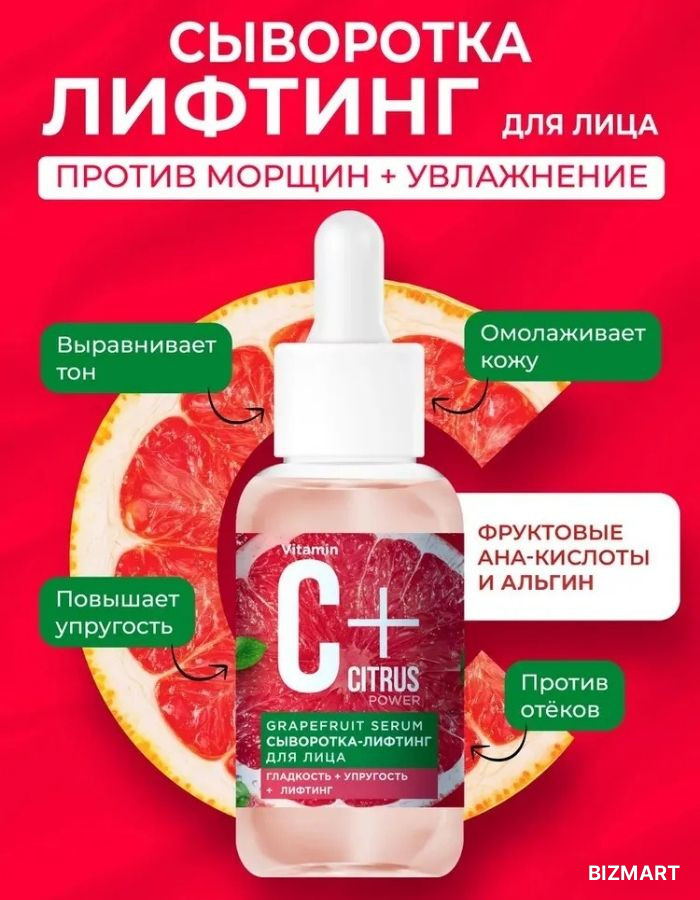 Сыворотка - лифтинг для лица GRAPEFRUIT SERUM C+Citrus от Фитокосметик с AHA-кислотами и витамином С против морщин, созданная для восстановления свежести и упругости вашей кожи, мгновенно повышает её тонус и придает ухоженный вид. В её формуле используется альгинат, богатый природными минералами и витаминами, который обладает выдающимися увлажняющими и успокаивающими свойствами. Этот компонент помогает восстановить баланс влаги в клетках кожи, улучшая общий вид и текстуру кожи. Альгинат способствует созданию защитного барьера кожи, который удерживает влагу в клетках, предотвращая обезвоживание и потерю тонуса.