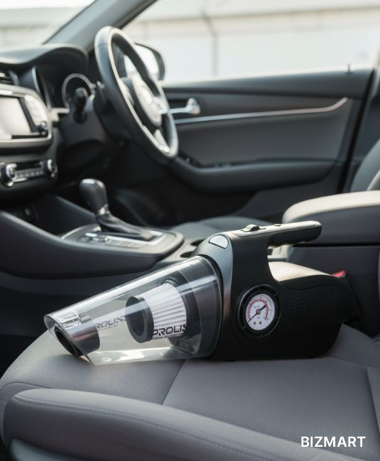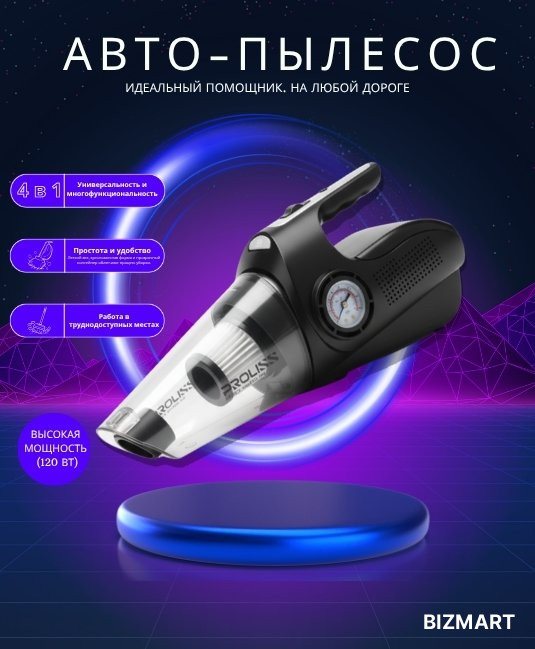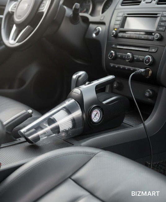 Многофункциональный автомобильный пылесос PROLISS Wizard Aid 4 в 1 — идеальное решение для поддержания чистоты и порядка в салоне вашего авто. Мощное всасывание 5000 PA эффективно убирает пыль, крошки и мусор даже в труднодоступных местах. Встроенный компрессор позволяет быстро накачать шины, мячи или матрасы, а манометр обеспечивает точный контроль давления.