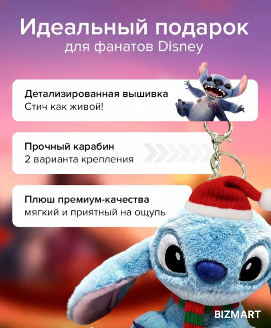 Очаровательный брелок в виде любимого персонажа Stitch станет ярким дополнением к вашим ключам, рюкзаку или сумке. Изготовлен из мягкого приятного на ощупь материала, не вызывает раздражения и подходит для детей и взрослых. Компактный размер позволяет носить его с собой повсюду, а праздничный шарфик и шапочка добавляют новогоднего настроения. Отличный подарок для поклонников мультфильма и просто любителей милых аксессуаров.