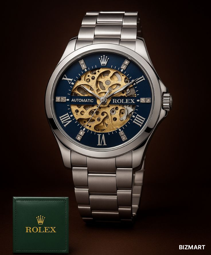 Мужские наручные часы Rolex оснащены механическим автоматическим механизмом. Корпус выполнен из нержавеющей стали, циферблат в формате скелетон с синим ободом и римскими цифрами. Металлический браслет регулируется по длине. Минеральное стекло защищает от царапин.