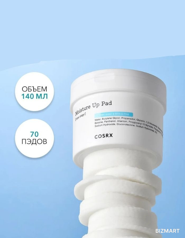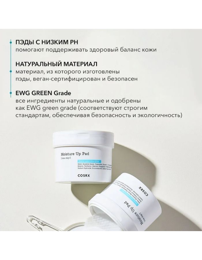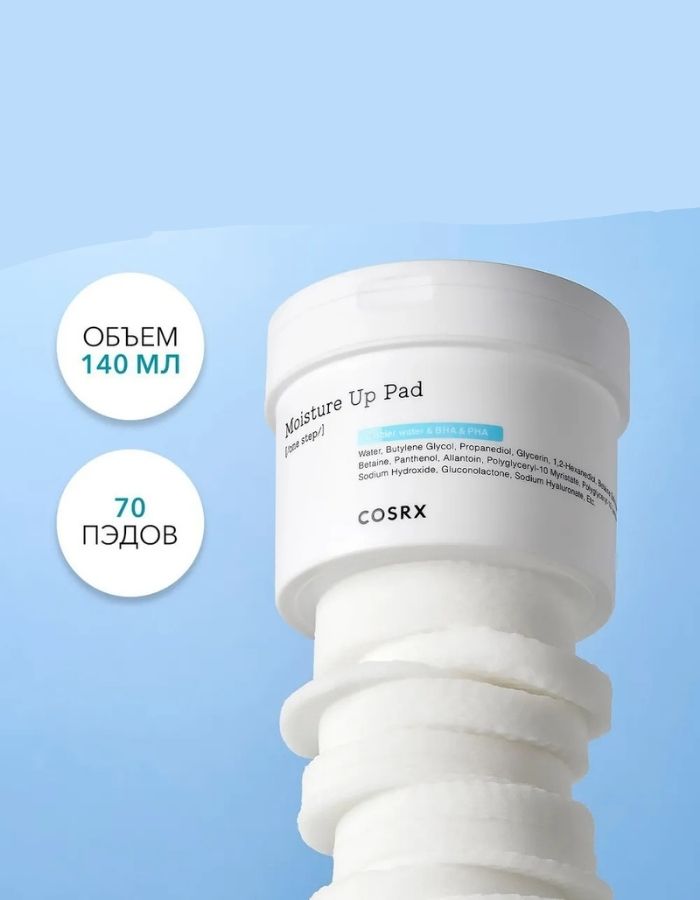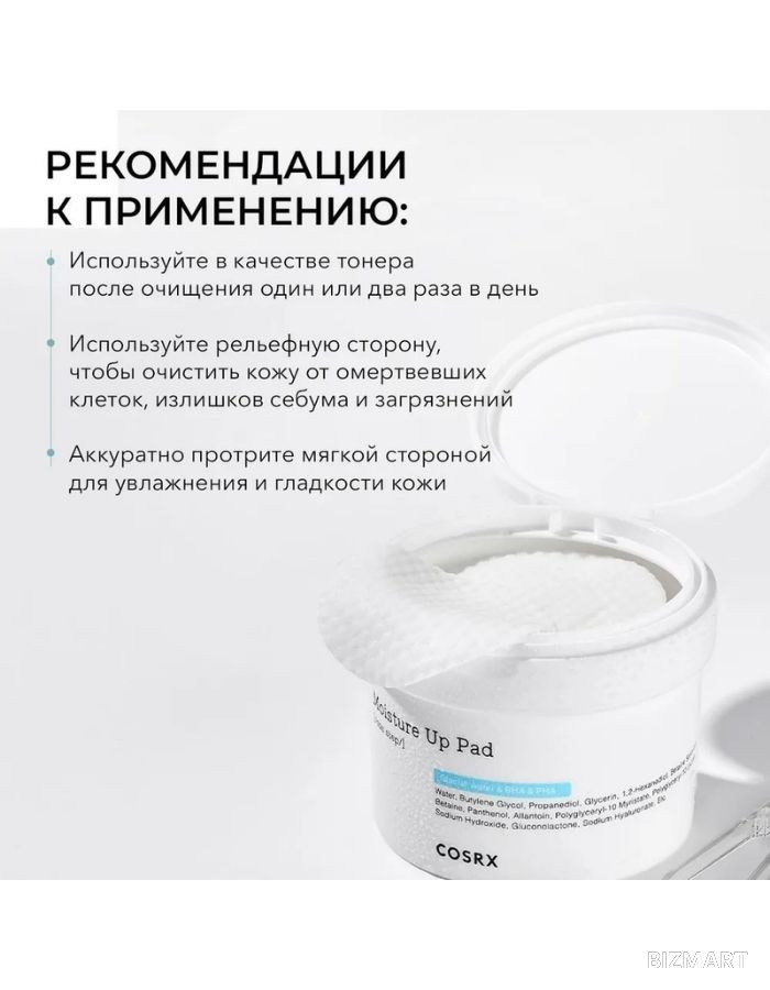 Обогащенные гиалуроновой кислотой, экстрактом прополиса и натуральной ВНА-кислотой, диски One Step Moisture Up Pad тщательно, но очень мягко, не вызывая раздражений, очищают кожу от загрязнений и кожного жира, удаляют мертвые клетки, выравнивают тон и текстуру кожи, успокаивают раздражения и воспаления, заметно улучшают цвет лица, прекрасно балансируют и увлажняют кожу, способствуя лучшему проникновению активных веществ вглубь кожи и созданию идеального макияжа. Способ применения: После очищения мягко протрите кожу, избегая область вокруг глаз, диском стороной с тисненой поверхностью (embossed side) для того, чтобы очистить кожу от мертвых клеток, остатков загрязнений и излишков себума. Затем протрите кожу мягкой стороной диска (soft side). Объем: 70 шт.
