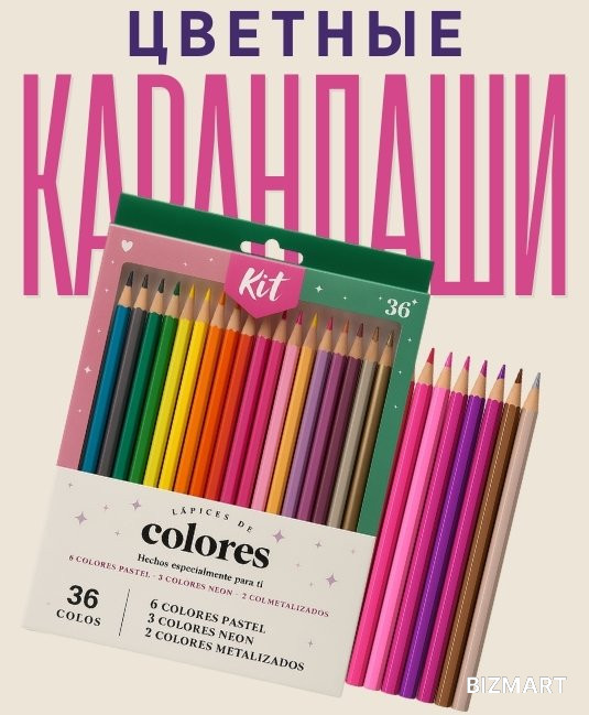 Цветные карандаши Colores Kit, 36 цветов — универсальный набор для рисования, раскрашивания и учебных занятий. В комплект входят классические оттенки, а также специальные варианты: пастельные, неоновые и металлизированные. Карандаши имеют прочный деревянный корпус, легко затачиваются и обеспечивают мягкое и ровное нанесение цвета.