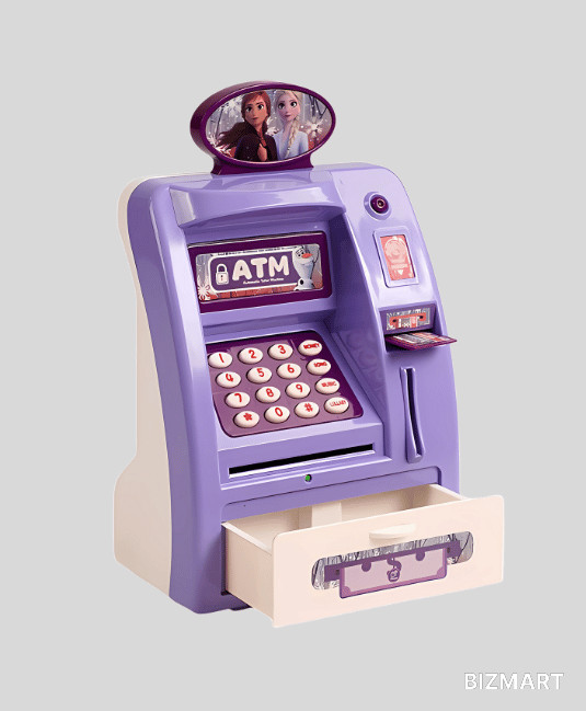 Игрушка изготовлена в форме банкомата со всем знакомым мультяшным персонажем. Копилка является настоящим мини сейфом, в котором сбережения вашего ребенка будут в полной безопасности, ведь он закрывается на кодовый замок и даже имеет игрушечный сканер пальца.