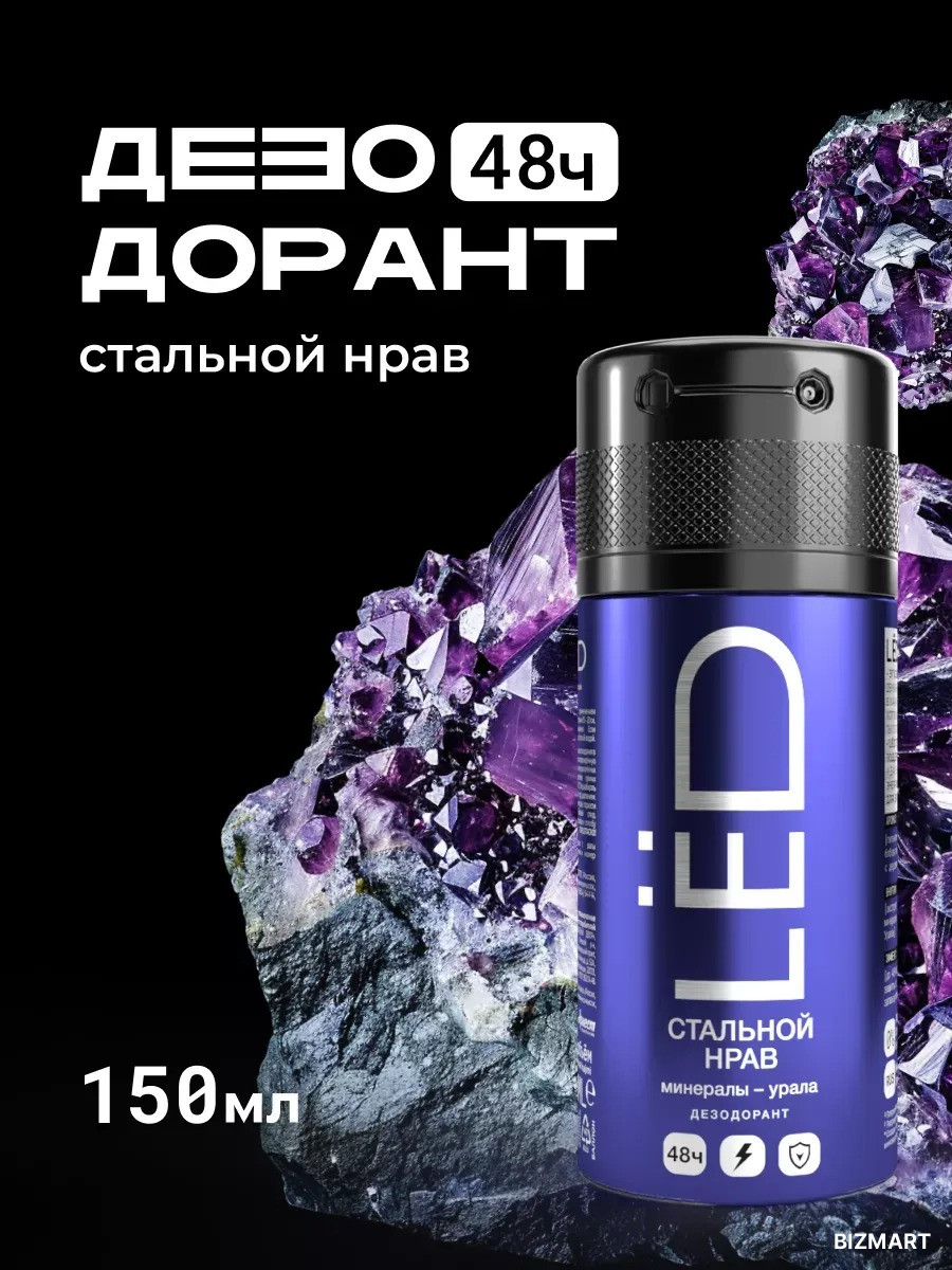 Дезодорант LЁD "Стальной нрав" — это уверенность на весь день. Мощная формула с минералами Урала (аметист, малахит, турмалин) обеспечивает 48 часов защиты от запаха, не раздражая кожу. Без парабенов, подходит даже для чувствительной кожи.
