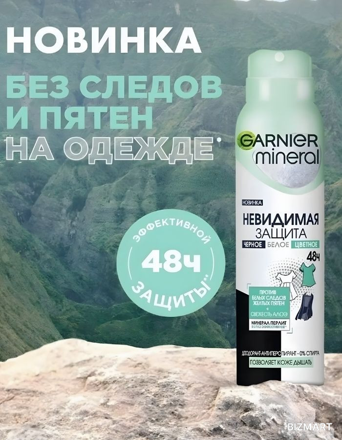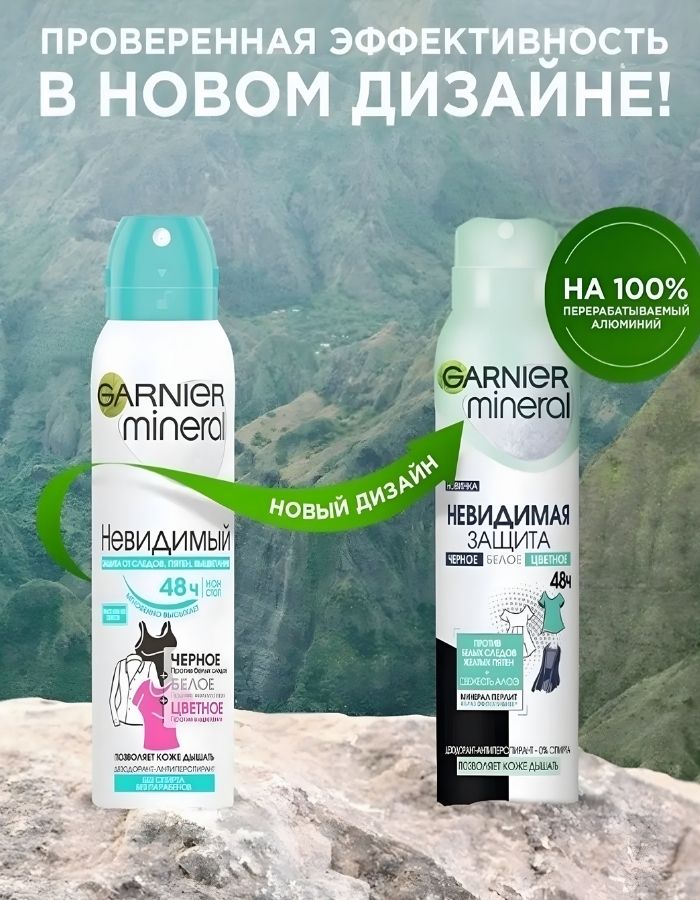 Дезодорант-антиперспирант спрей для тела Mineral Невидимая защита 48ч. Свежесть алоэ. Черное, Белое, Цветное, женский, 150 мл. Защита от следов, пятен, выцветания "Свежесть Алоэ" с активными минералами, защита 48 часов, женский, 150 мл. Обогащен минералом перлит. Защита от потоотделения. Позволяет коже дышать. СПОСОБ ПРИМЕНЕНИЯ: 1. Вымойте и высушите подмышки. 2. Хорошо встряхните флакон.3. Распылите дезодорант Гарньер в течение 2-3 секунд на расстоянии около 15 см. 4. Подождите несколько секунд. 5. Одевайтесь. В случае засорения, переверните флакон и промойте диффузор горячей водой. Баллон находится под давлением: может лопнуть при нагревании. Огнеопасно. Держать вдали от тепла, раскаленных предметов, открытого огня и других источников воспламенения. При использовании не курить. Не распылять вблизи открытого огня или других источников воспламенения. Не вскрывать и не сжигать, даже после использования. Предохранять от воздействия прямых солнечных лучей. Не подвергать воздействию температуры выше 50° C. Хранить в недоступном для детей месте. Избегать распыления в глаза, на раздраженную кожу. Намеренно не вдыхать. Использовать только для целей, указанных на упаковке. Не использовать в замкнутом пространстве. Освобожденный от содержимого баллон утилизируют как бытовой отход.
