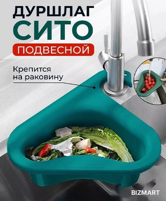 "Забыли о забитых сливах и неприятных хлопотах? Подвесное сито для раковины — идеальное решение! Легко крепится на кухонный кран, позволяя собирать остатки еды, очищать овощи и поддерживать порядок на кухне. Используйте его как удобное место для хранения губок или тряпок. Практичность и чистота каждый день!"