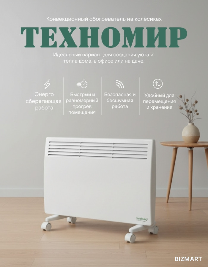 Современный конвекционный обогреватель — это сочетание стиля, надёжности и эффективности. Компактный корпус с элегантным дизайном гармонично впишется в любой интерьер, а встроенный термостат позволит поддерживать комфортную температуру в помещении без лишних затрат энергии.