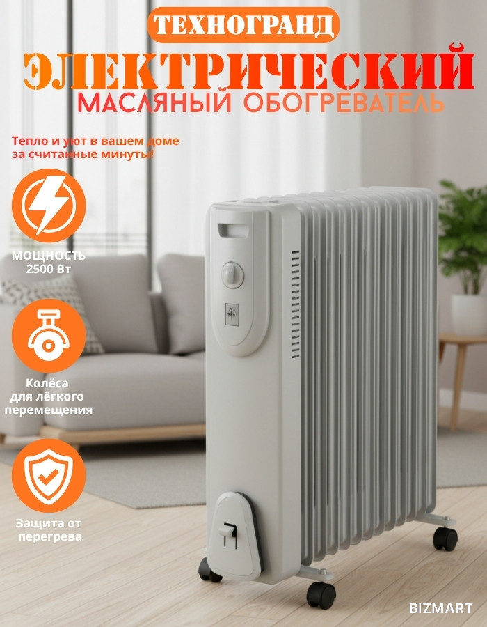 Надёжный и мощный масляный обогреватель ТЕХНОГРАНД быстро создаст тепло и уют в вашем доме. Современный дизайн и высокая эффективность делают его отличным выбором для обогрева спальни, гостиной или офиса.