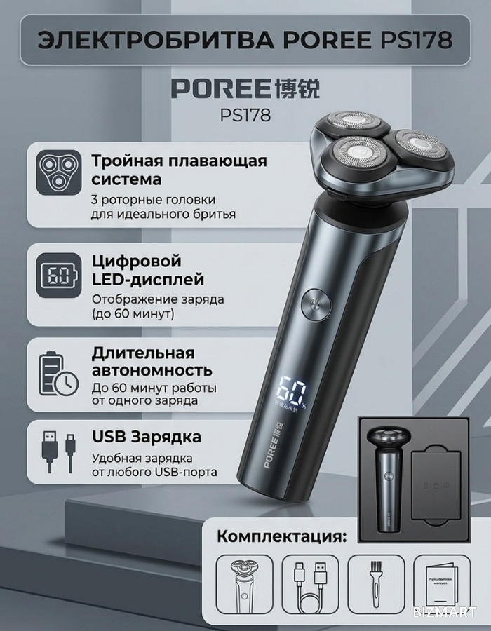 Электробритва POREE PS178 — это современное решение для быстрого и аккуратного ухода за щетиной. Модель сочетает в себе стильный дизайн, надёжные материалы и удобство эксплуатации, обеспечивая комфортное бритьё как дома, так и в поездках.