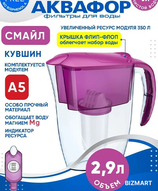 Фильтр-кувшин Аквафор Смайл — компактное и удобное решение для очистки воды без сложного монтажа. Оснащен сменным картриджем A5 с ресурсом 350 литров, который эффективно удаляет хлор, ржавчину, тяжелые металлы и механические примеси.