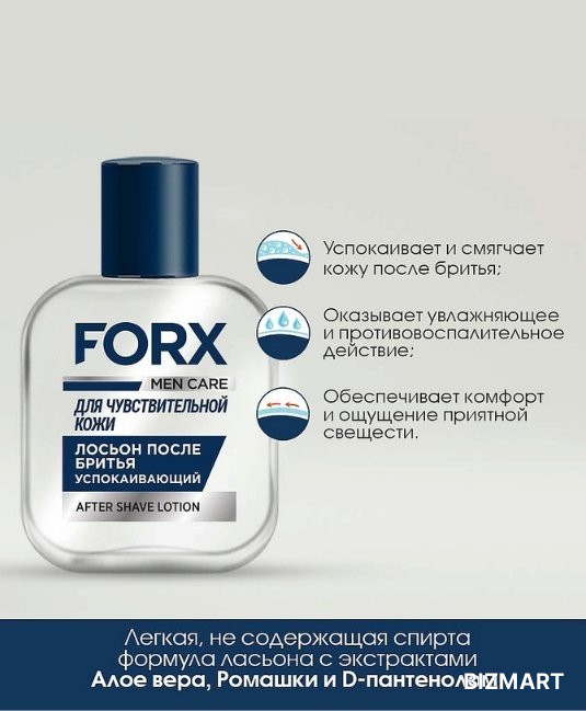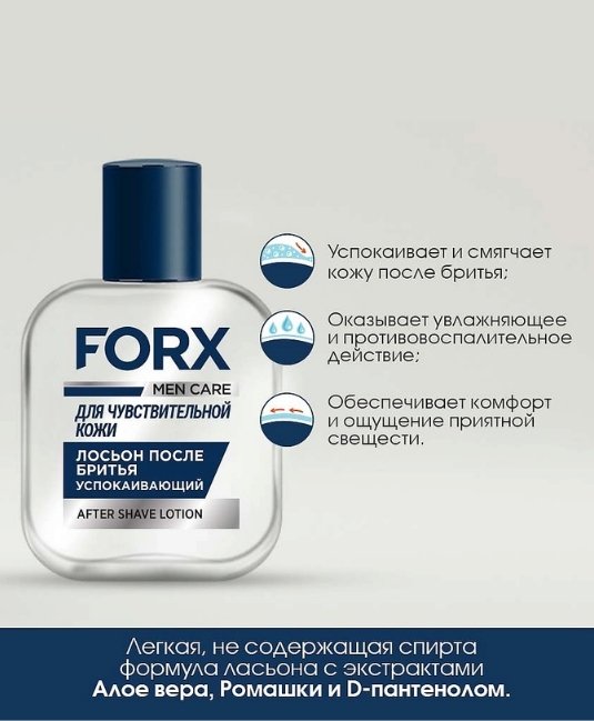 Лосьон после бритья мужской для чувствительной кожи Sensitive Skin FORX - это экстра мягкий уход за кожей. Бесспиртовой успокаивающий лосьон после бритья для чувствительной кожи разработан специально для мужчин, чья кожа: склонна к раздражению; ощущению стянутости после бритья; нуждается в дополнительном увлажнении и смягчении.