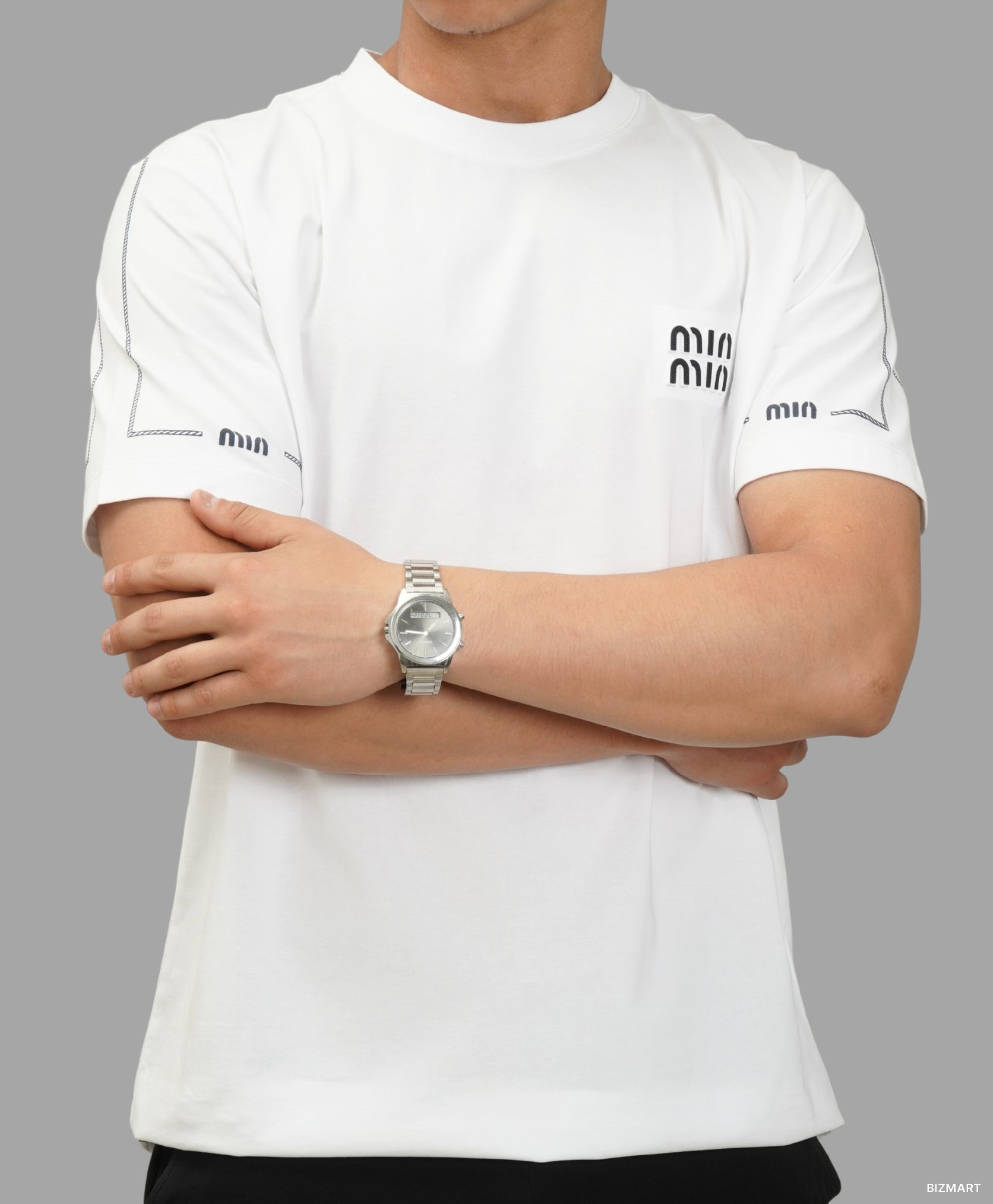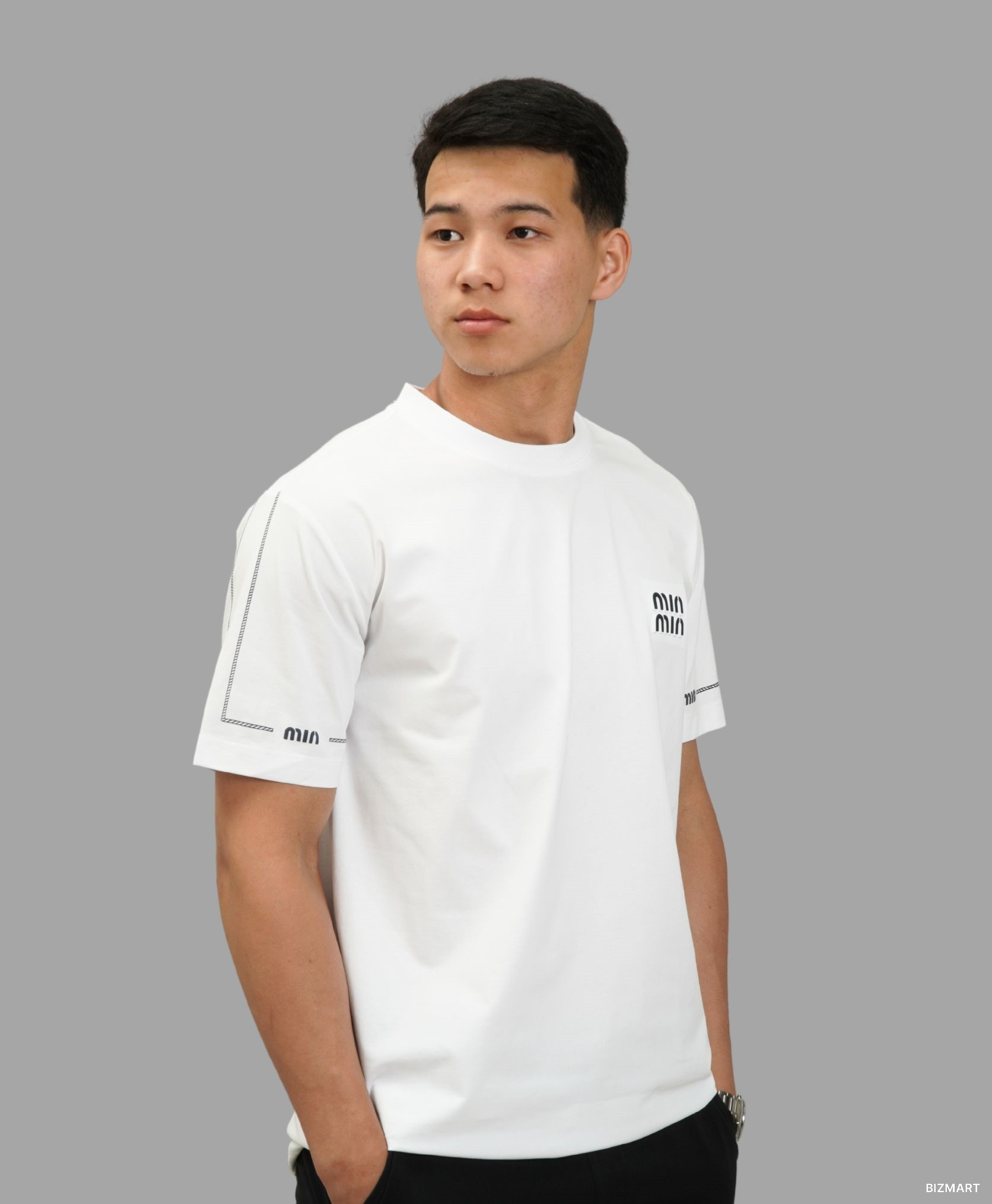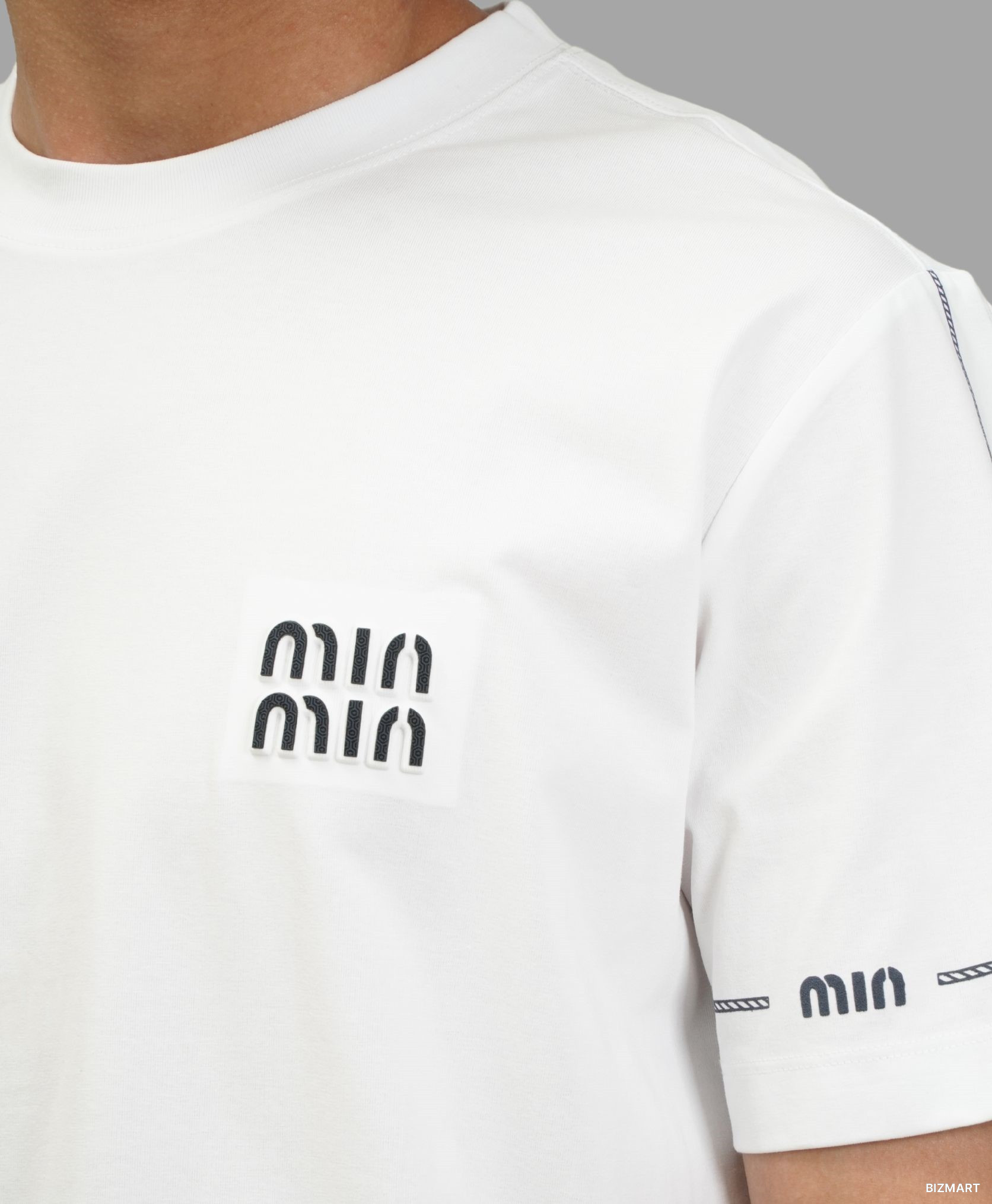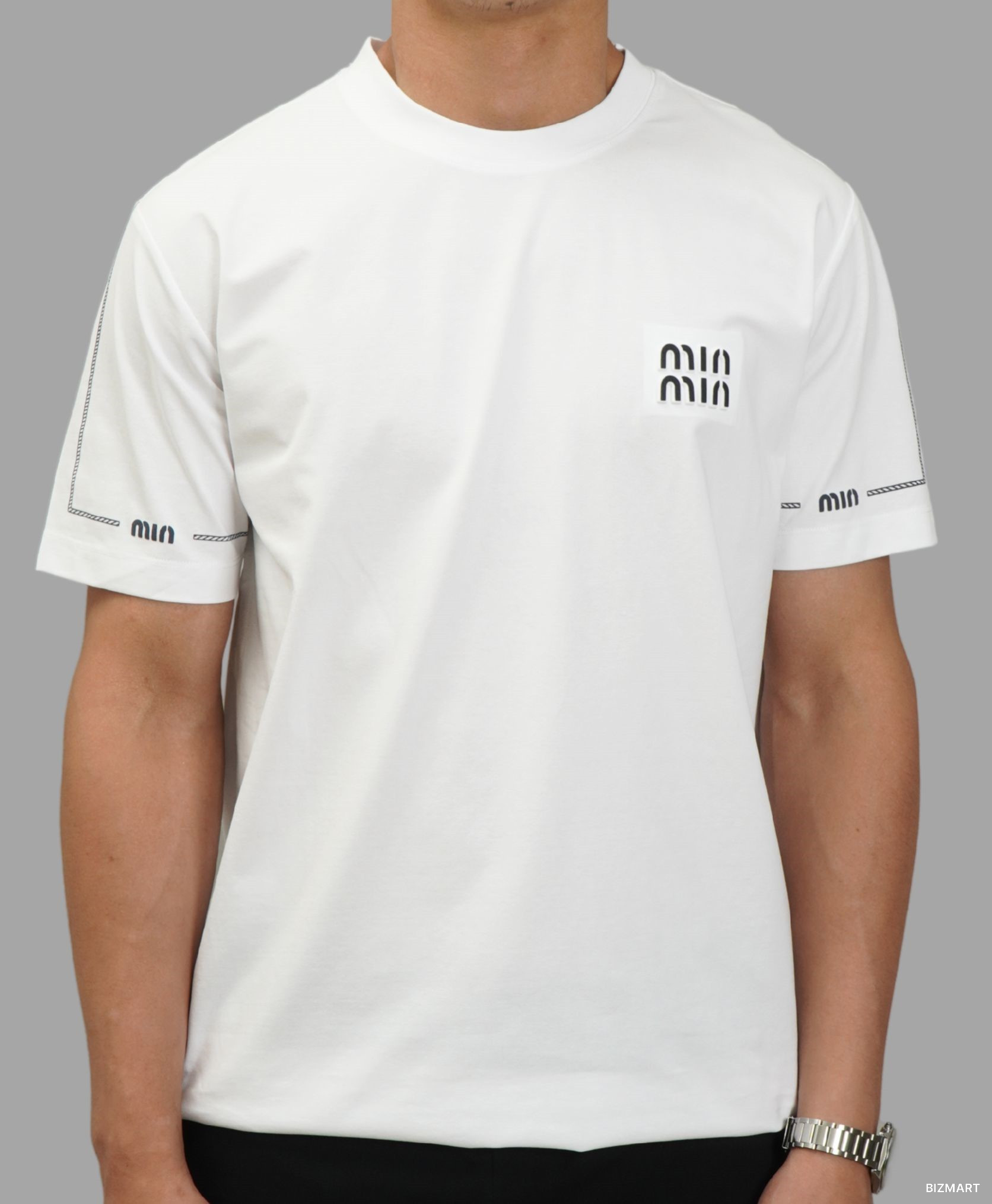 Мужская белая футболка в стиле Miu Miu с логотипом на груди — это сочетание простоты и модного акцента. Лаконичный дизайн подчёркивает вкус, а мягкий и приятный к телу материал обеспечивает комфорт на весь день. Белый цвет освежает образ и легко комбинируется с любой одеждой — от джинсов до спортивных штанов. Отличный вариант для повседневной носки или прогулок в тёплую погоду.