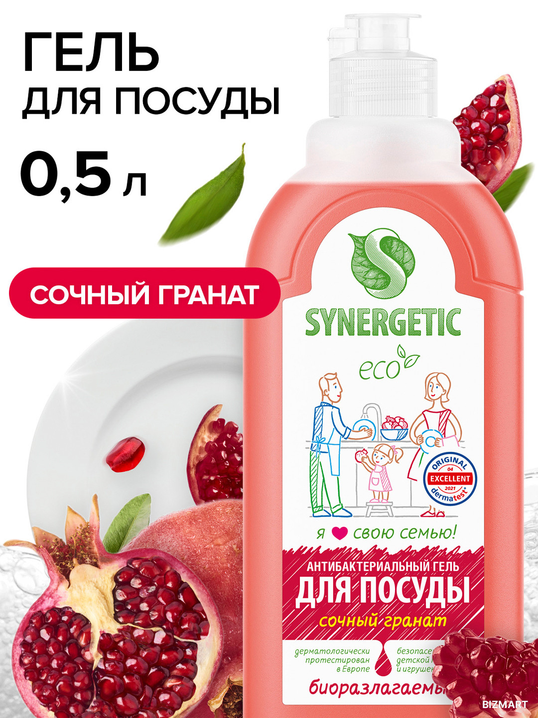 Биоразлагаемый концентрированный гель для посуды с антибактериальным эффектом SYNERGETIC - это экологичное, безопасное и эффективное средство для мытья всех видов посуды, в том числе детской, кухонного инвентаря и детских игрушек от любых видов загрязнений. Он не оставляет следов на посуде. Мягкие биоразлагаемые тензиды из растительного масла обеспечивают хорошее пенообразование и эффективно удаляют жир и запахи даже в холодной воде. Глицерин растительного происхождения в составе средства защищает кожу рук от сухости и раздражения. Гипоаллергенная парфюмерная композиция на основе эфирных масел лимона, бергамота, ветивера придает средству свежий и приятный аромат. Гель дерматологически протестирован независимым исследовательским институтом Dermatest® в Германии. Биоразлагаемые компоненты безопасны для природы и человека и не вредят микрофлоре септических установок при использовании средства в соответствии со способом применения.