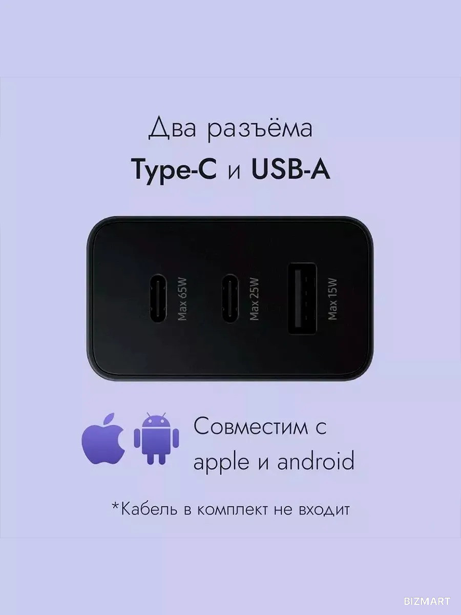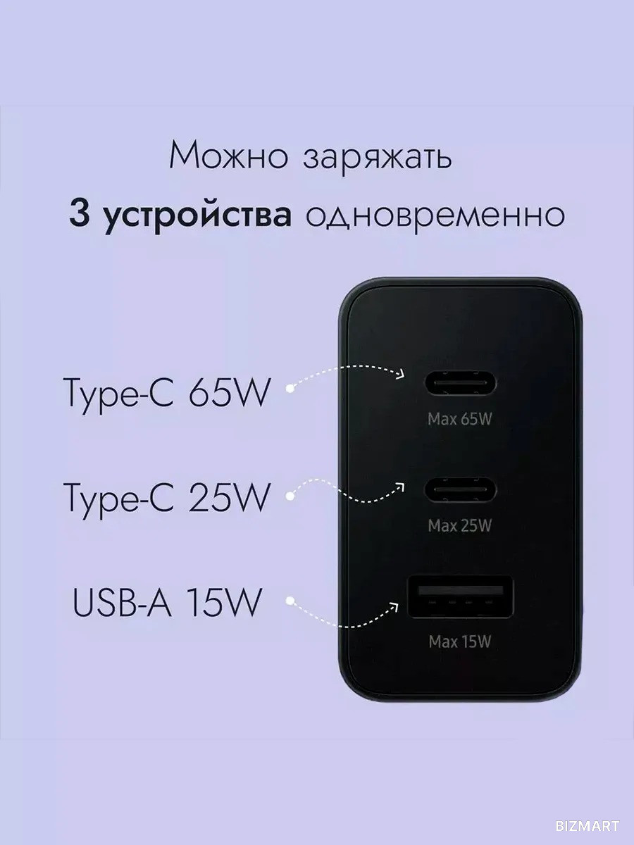 Три разъема: два Type-C (до 65 Вт и 45 Вт) + один USB-A (15 Вт)