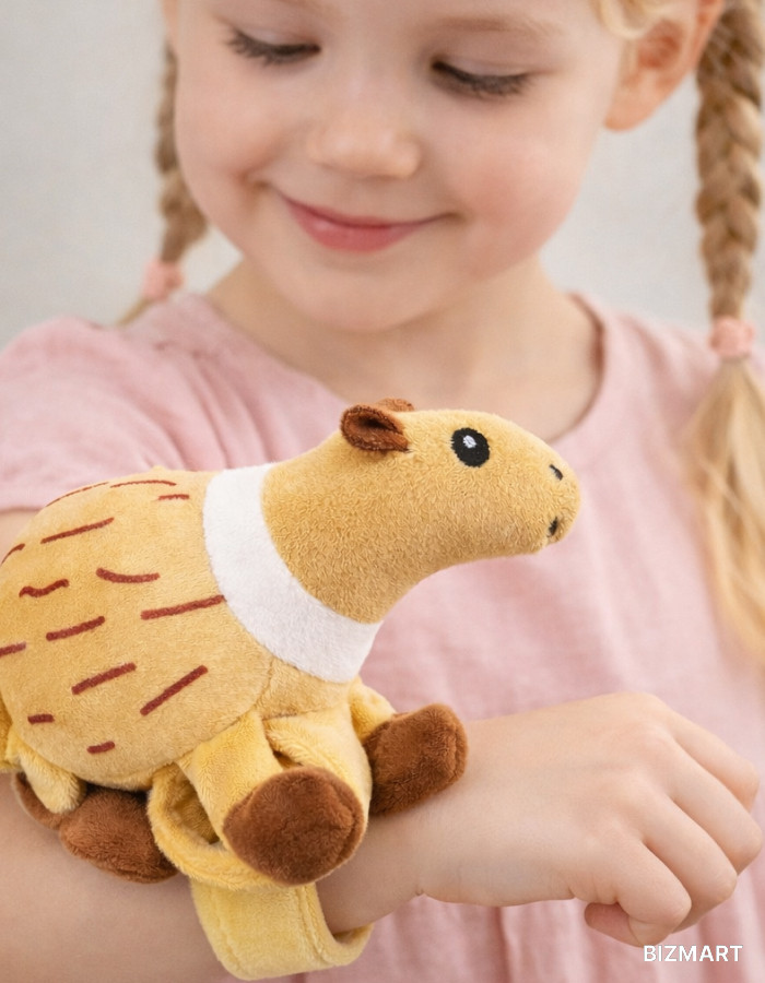 Очаровательная мягкая игрушка в виде капибары с удобной липучкой-браслетом — стильный аксессуар и любимый друг для ребёнка. Легко крепится на руку, рюкзак, сумку или коляску и всегда остаётся рядом.
