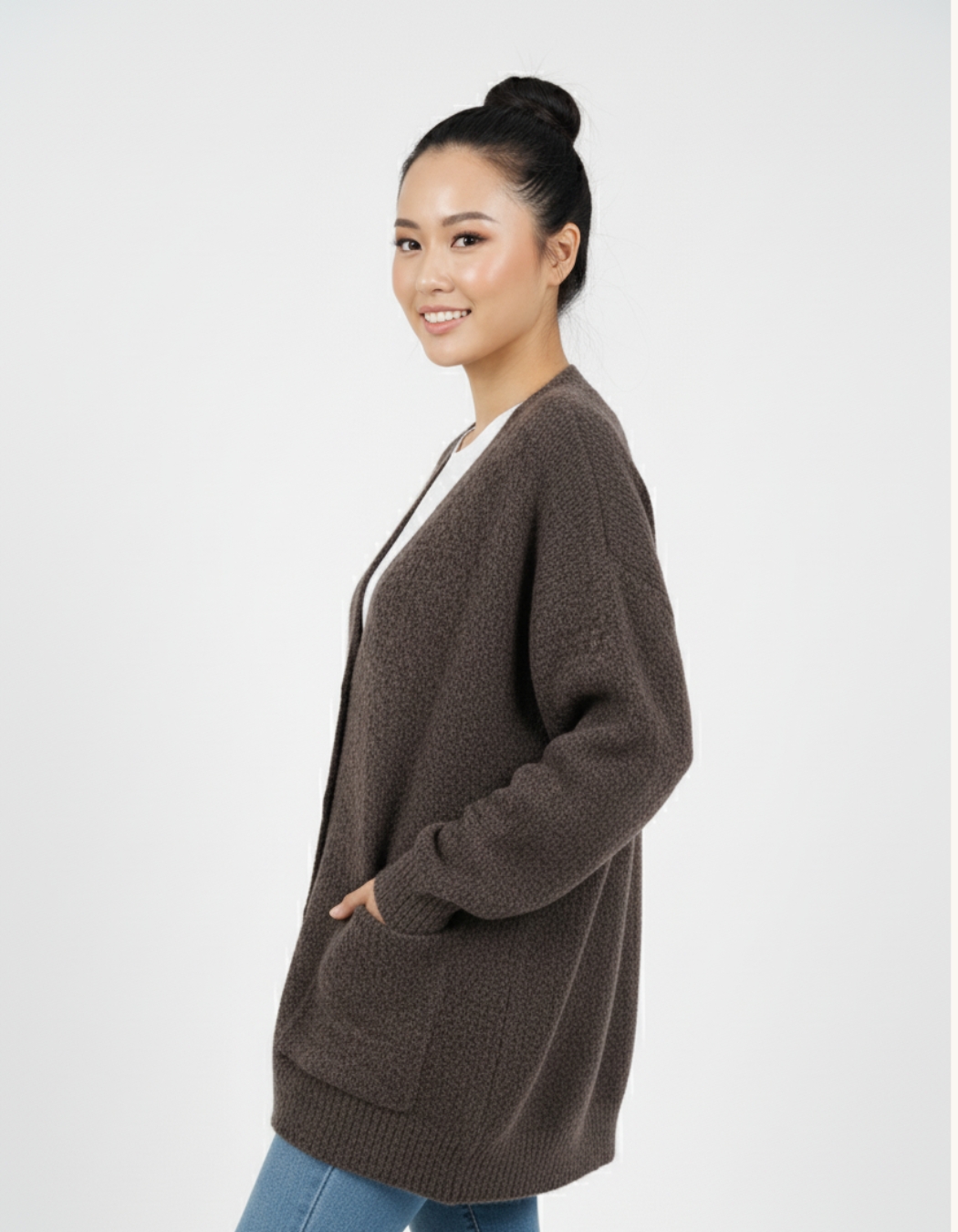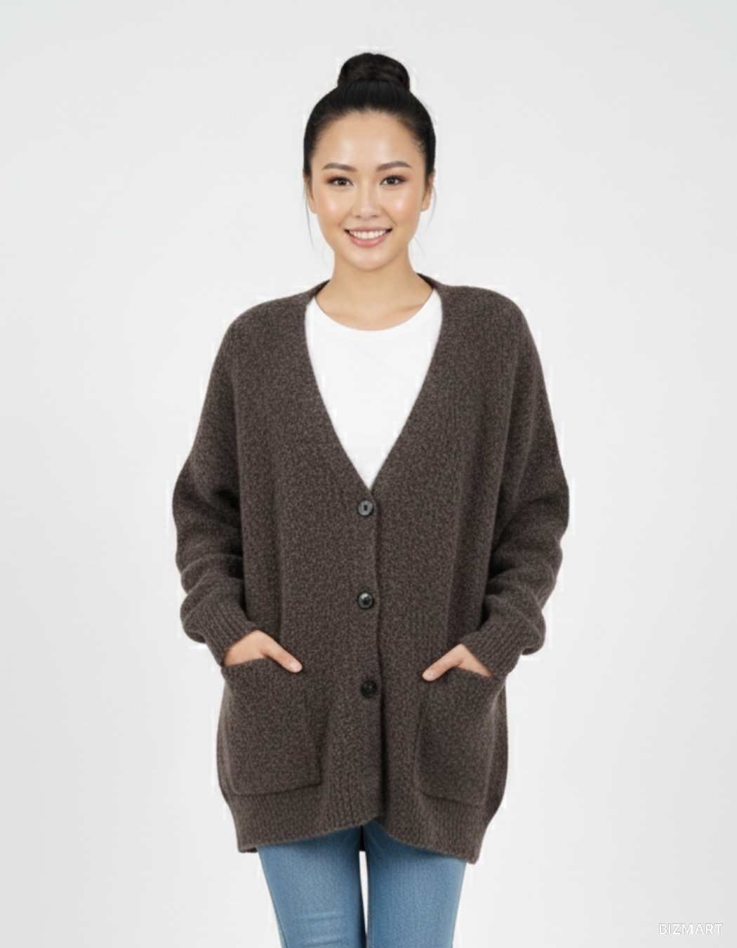 Мягкий, уютный и стильный кардиган свободного кроя. Изготовлен из тёплого трикотажа с лёгким ворсом — приятен к телу и отлично сохраняет тепло. Классический V-образный вырез и крупные пуговицы придают изделию аккуратный и современный вид.