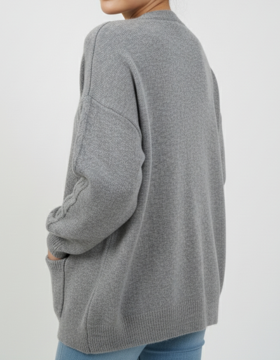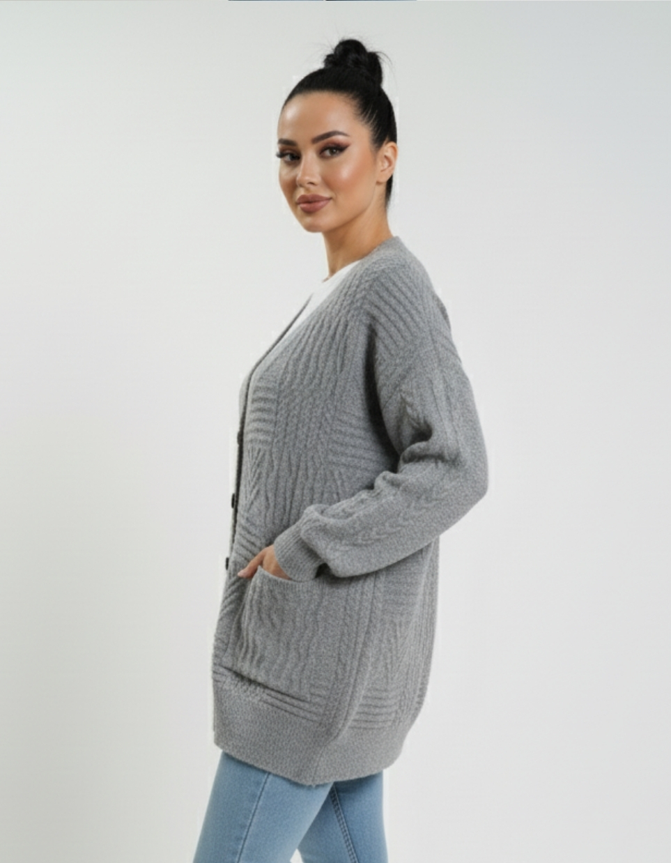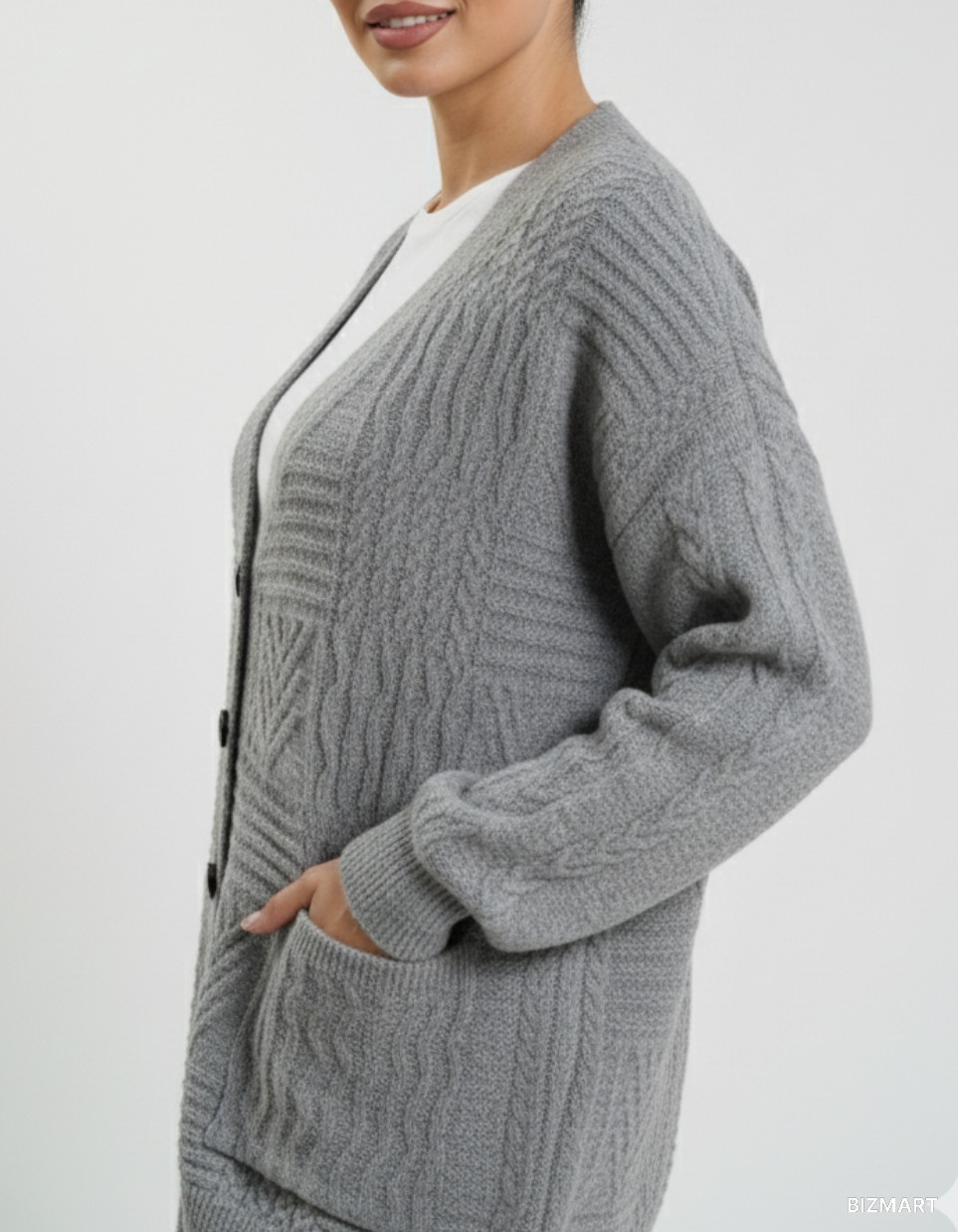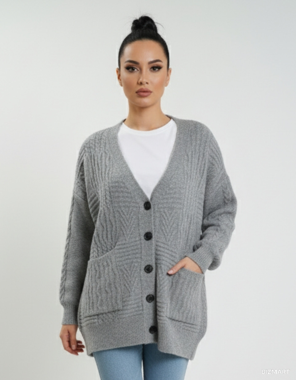 Уютный кардиган свободного кроя — идеальный вариант для прохладных дней. Выполнен из мягкого трикотажа с выразительной фактурной вязкой. Крупные пуговицы и глубокий V-образный вырез придают образу стиль и легкость. Два вместительных накладных кармана добавляют удобства.