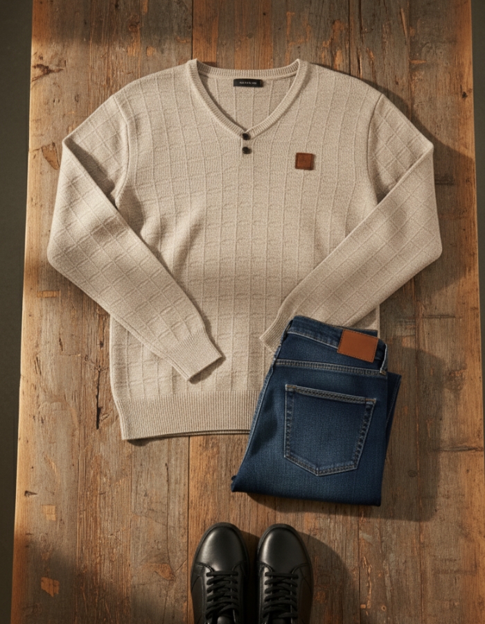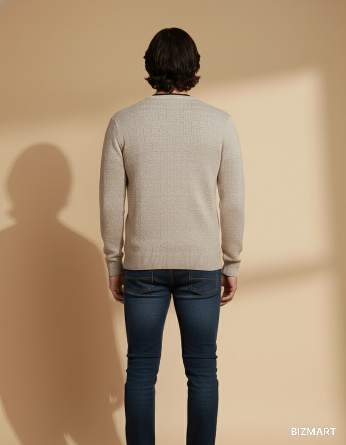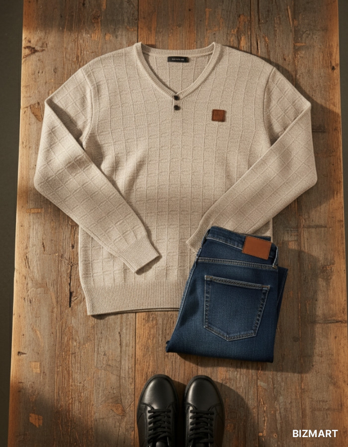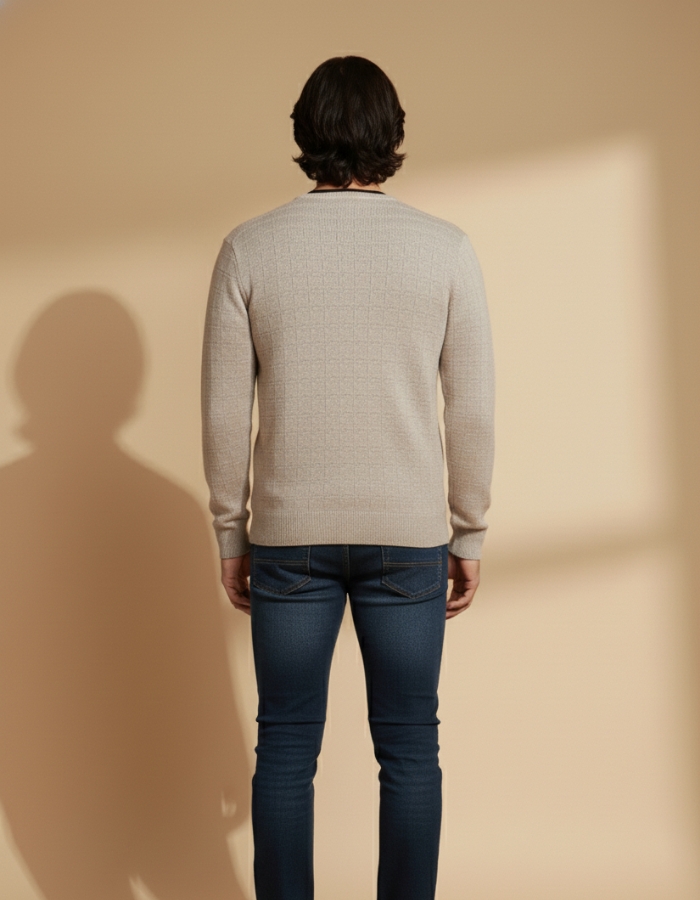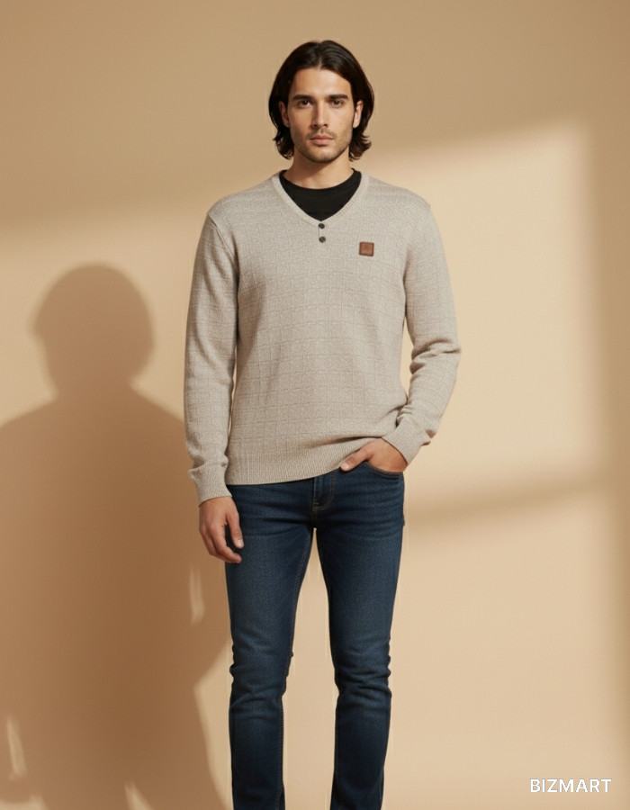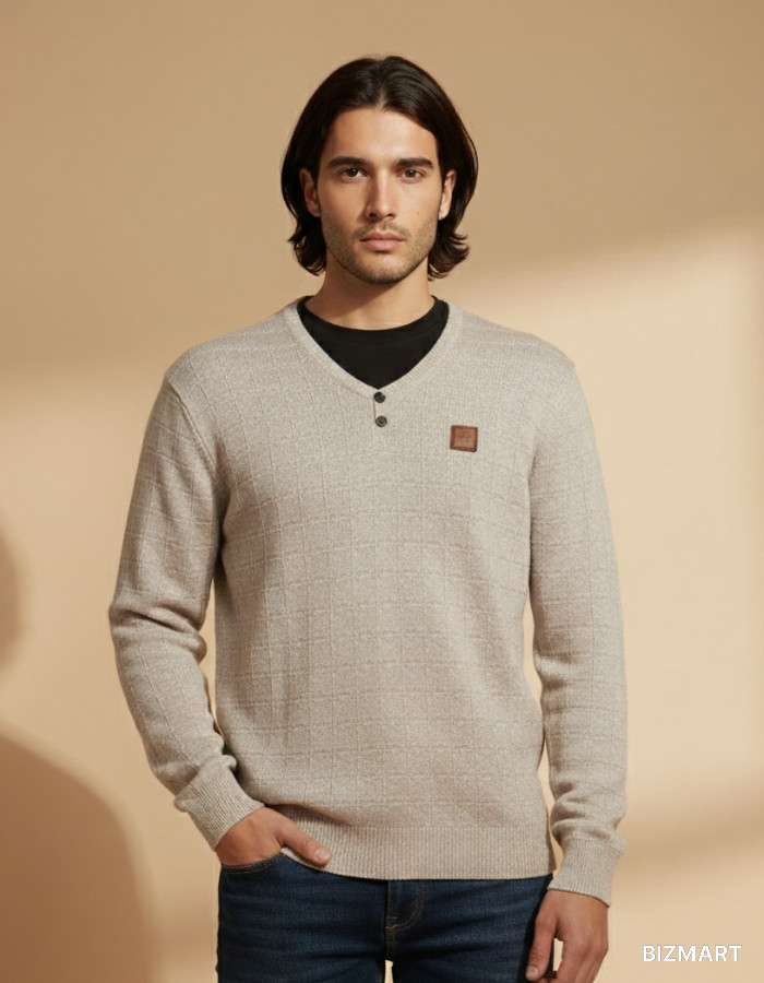 Стильный мужской свитер из мягкого трикотажа в светло-бежевом оттенке. Модель выполнена с аккуратным V-образным вырезом и декоративными пуговицами, что добавляет образу элегантности. Фактурный клетчатый узор делает свитер более выразительным, а небольшой шеврон JH на груди подчёркивает современный стиль.