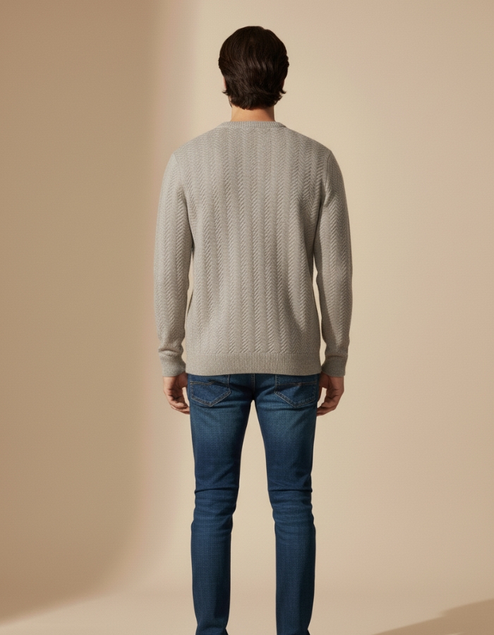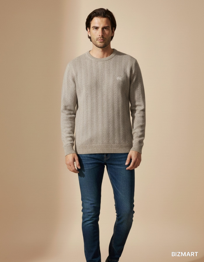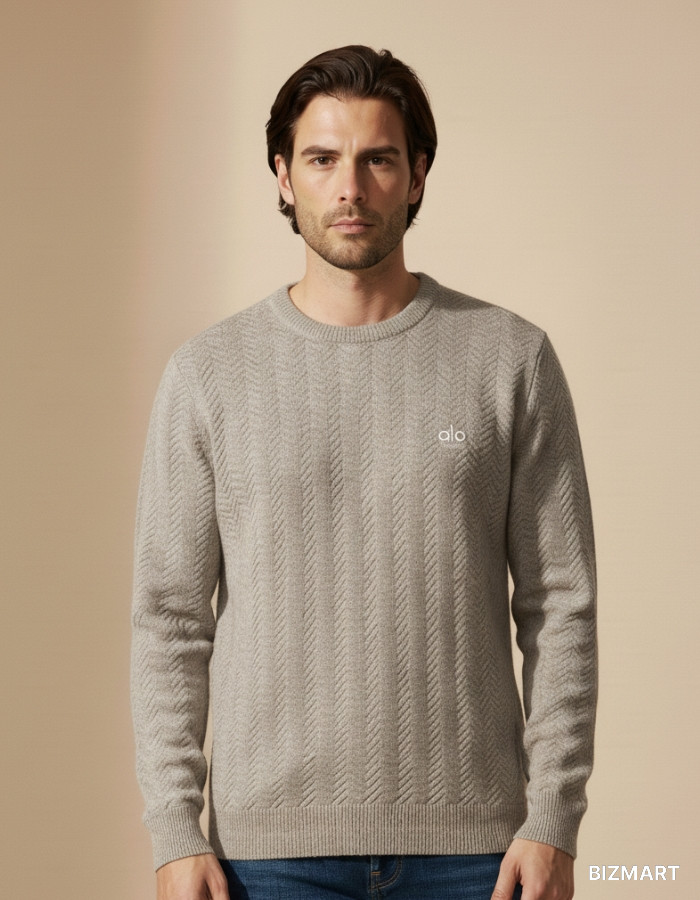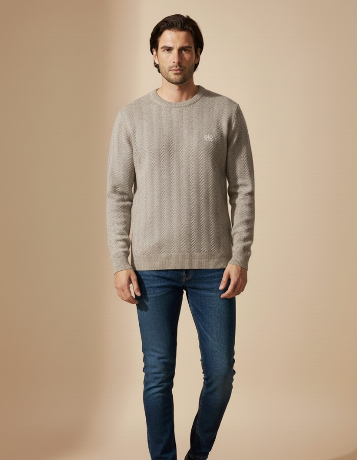 Стильный мужской свитер из мягкого трикотажа с рельефным узором «ёлочка». Модель имеет круглый вырез горловины и аккуратную резинку по низу и манжетам. Материал приятен к телу, обеспечивает комфорт и тепло в прохладную погоду. На груди — лаконичный логотип Aulober, подчёркивающий современный стиль.