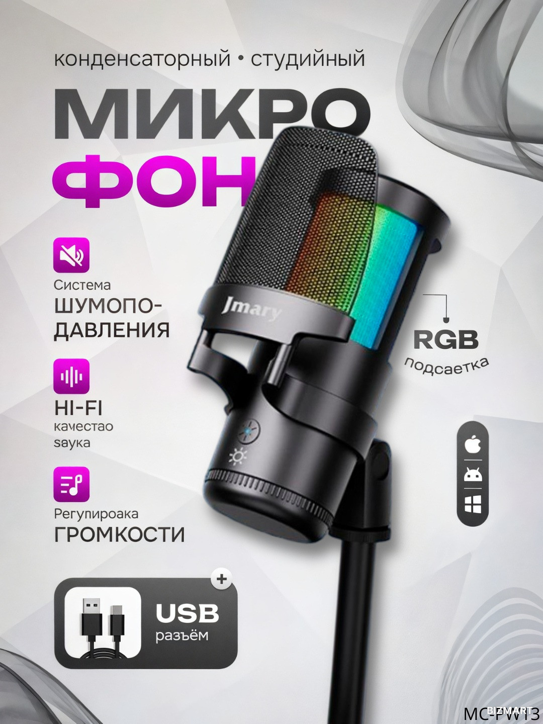 Микрофон JMARY MC-PW13 идеально подойдёт для стриминга, подкастов, онлайн-игр, записи вокала, онлайн-уроков и видеоконтента, обеспечивая профессиональное качество звука и стильный внешний вид.