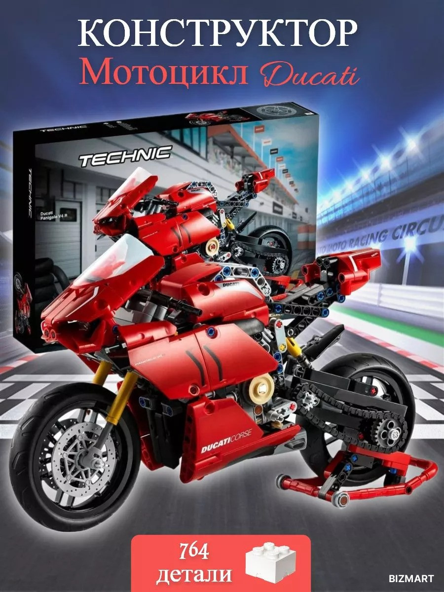 Конструктор «Байк Ducati» Technic Ducati Panigale V4 R состоит из 764 элементов и позволяет собрать реалистичную модель знаменитого спортивного мотоцикла. В собранном виде модель имеет размеры 32 × 8 × 16 см и максимально точно повторяет оригинал.