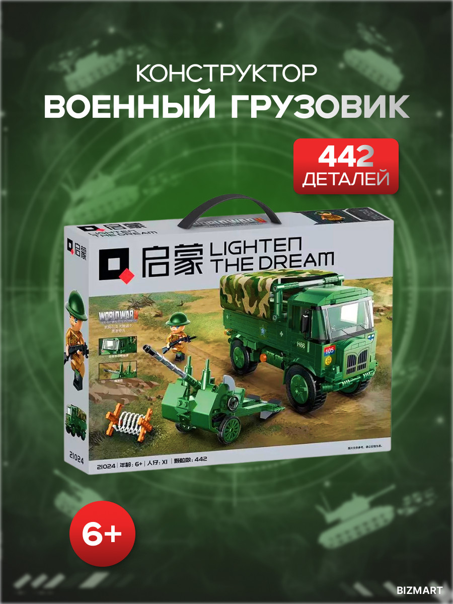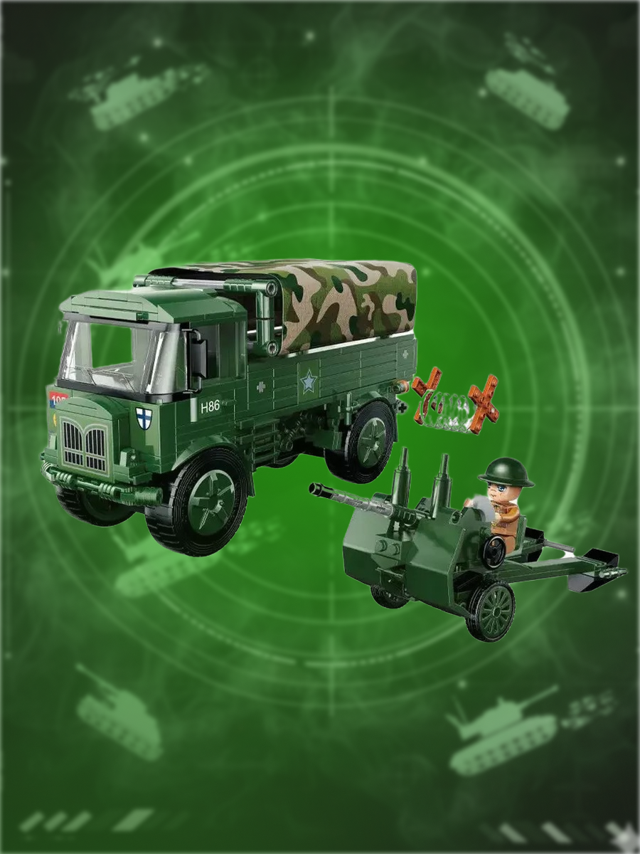 Конструктор «Военный грузовик» — это увлекательный набор из 442 элементов, предназначенный для детей от 6 лет. С его помощью ребёнок сможет собрать детализированную модель военного грузовика, погружаясь в процесс конструирования и сюжетной игры.
