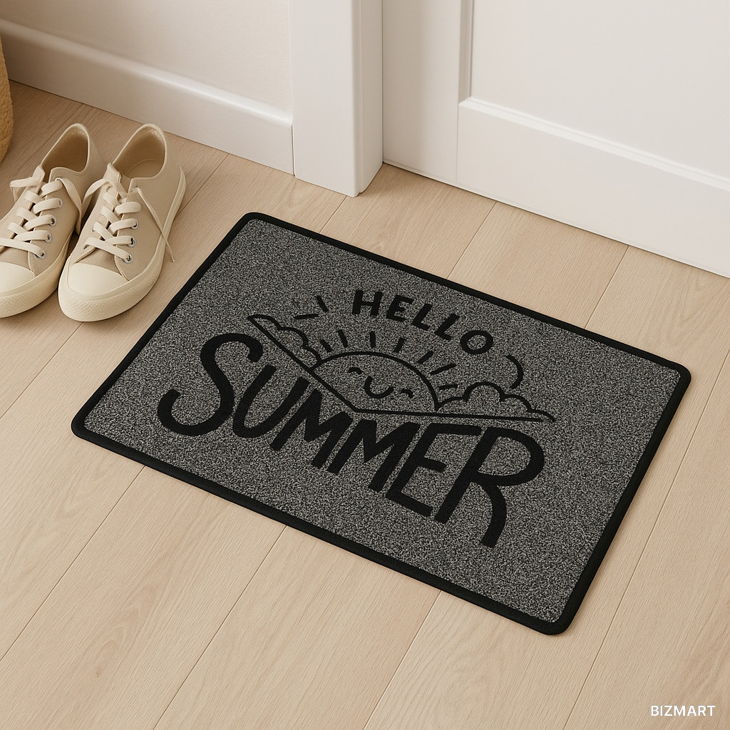 Практичный придверный коврик "Hello summer" размером 40×60 см в стильном чёрно-сером исполнении. Изготовлен из плотного и износостойкого материала, который хорошо задерживает грязь, пыль и влагу с обуви, сохраняя чистоту в доме.