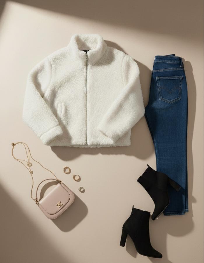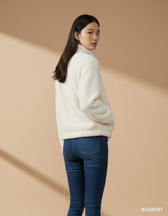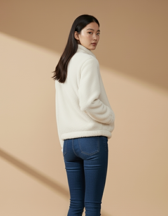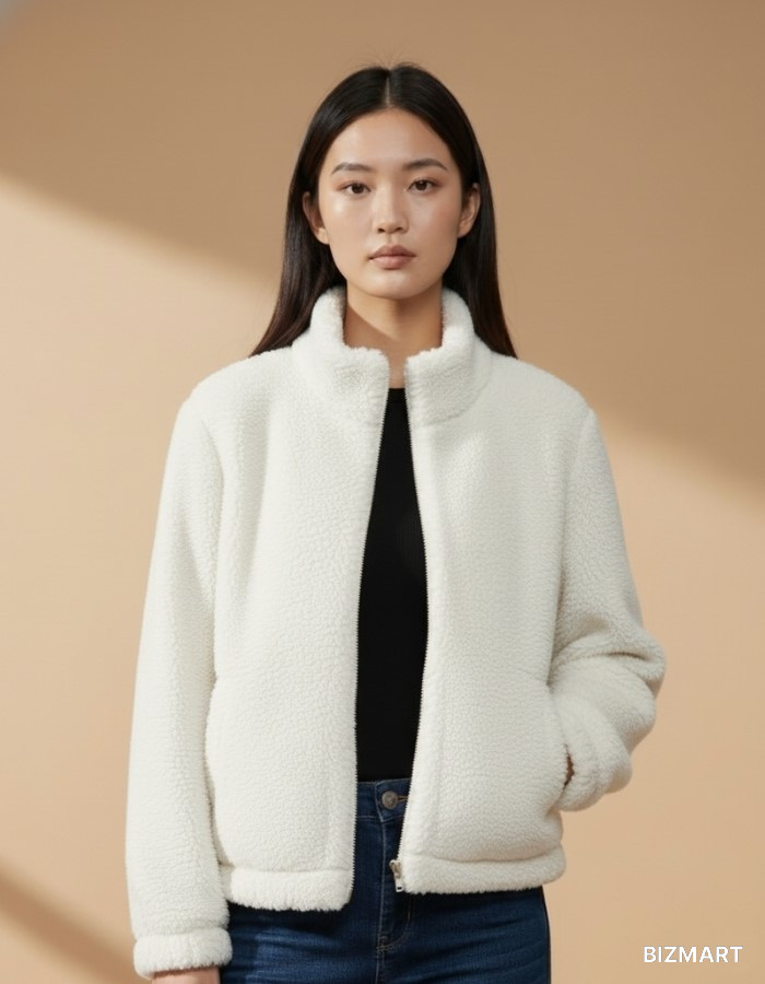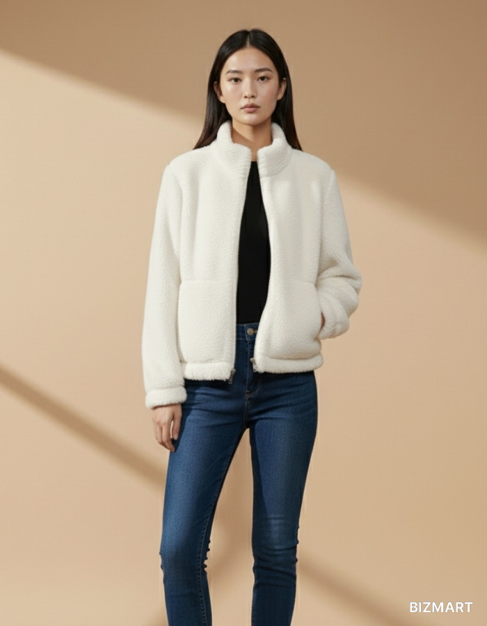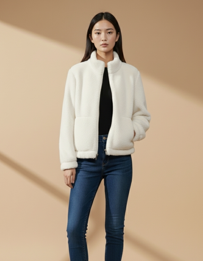 Мягкая и тёплая куртка тедди в стильном белом цвете. Изготовлена из плотного пушистого материала, который отлично удерживает тепло и дарит комфорт в прохладную погоду. Модель застёгивается на удобную молнию, а два боковых кармана делают куртку не только уютной, но и функциональной.
