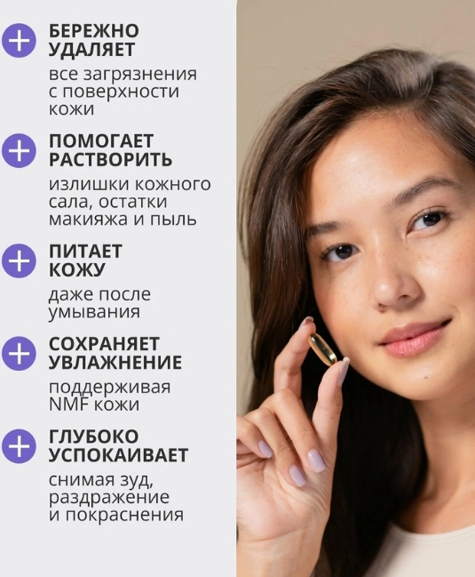 Увлажнение: Содержит увлажняющий комплекс Aqualicia®, который помогает клеткам кожи удерживать влагу после умывания.