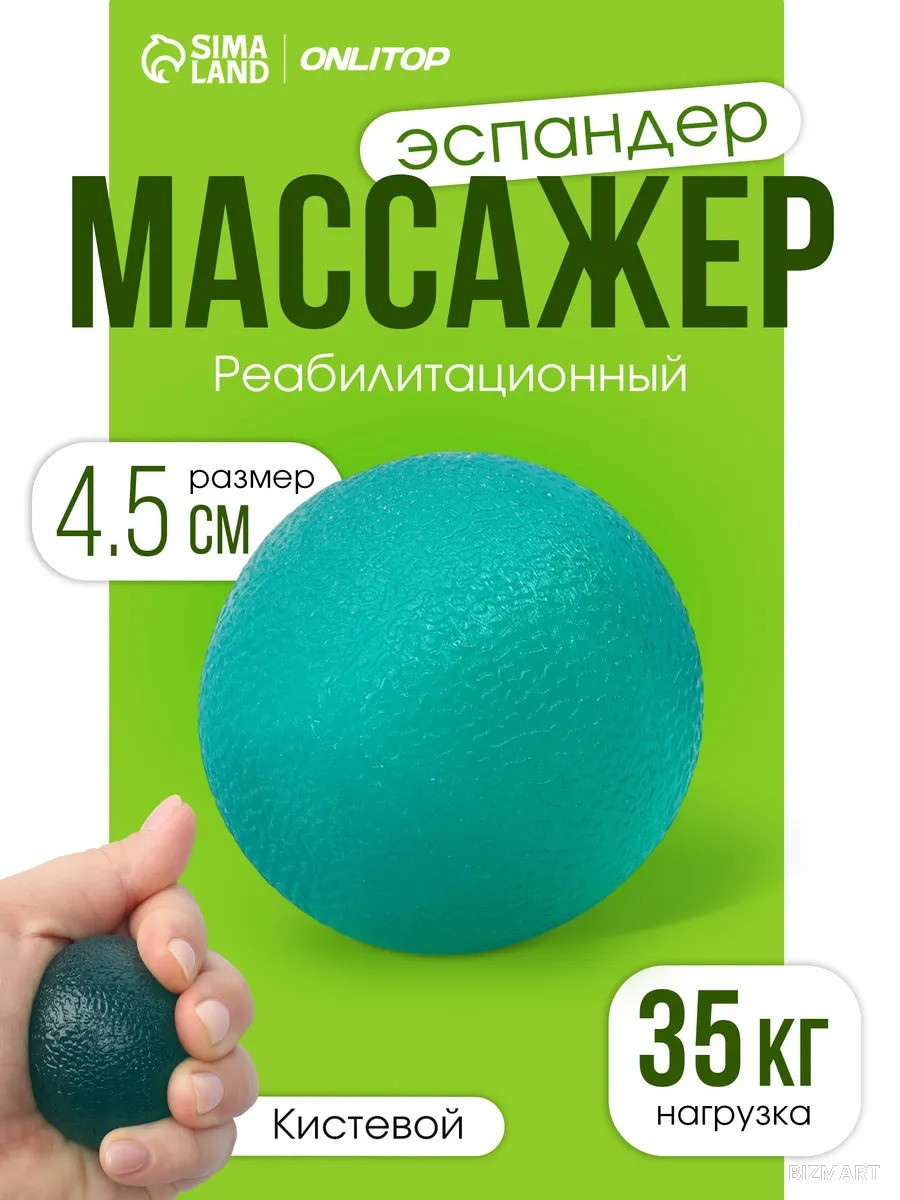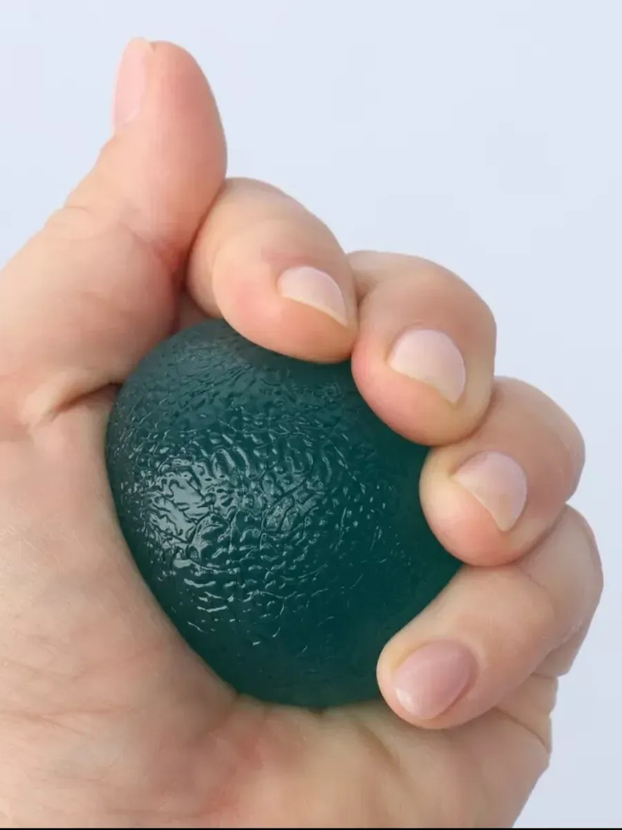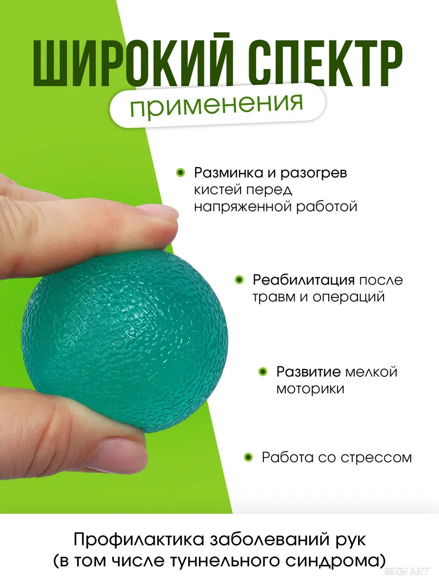 Мяч удобно ложится в ладонь (ширина 4,5 см), не скользит и выдерживает нагрузку до 35 кг. Его можно использовать как тренажёр для предплечья, антистресс-мяч или массажёр для снятия напряжения в руках после работы за компьютером и спорта.