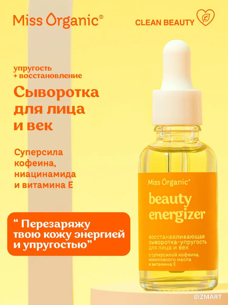 Твой коже нужен мощный апгрейд? Он уже у тебя в руках. Сыворотка для лица BEAUTY-ENERGIZER от Miss Organic с кофеином быстро уберет с лица следы ночной вечеринки, темные круги и отечность, а витамин Е приведет ее в тонус и насытит влагой, вернув упругость и гладкость. Утренняя прогулка с крашем теперь не вопрос! Восстанавливающая сыворотка подходит как для лица, так и для чувствительной кожи вокруг глаз. Она бережно убирает следы усталости, обеспечивая свежий и отдохнувший вид. Кофеин – основной активный компонент, мгновенно освежает и питает кожу. Его сосудосуживающие свойства уменьшают отечность и темные круги под глазами, придавая лицу здоровый и сияющий вид. Кофеин также стимулирует микроциркуляцию, улучшая обмен веществ в клетках кожи и заряжая ее энергией. В состав сыворотки входит ниацинамид (витамин B3), который выравнивает тон кожи, уменьшает воспаления и борется с признаками старения. Ниацинамид улучшает барьерную функцию кожи, позволяет удерживать влагу, предотвращая сухость и шелушение. Он помогает осветлить пигментацию и сократить поры, создавая более ровный рельеф кожи. Витамин Е – мощный антиоксидант, защищающий кожу от свободных радикалов и загрязнений. Он увлажняет и питает, сохраняет упругость и эластичность, способствует регенерации микротрещин, делая кожу более здоровой. Этот компонент идеально дополняет действие кофеина и ниацинамида. Сыворотка с кофеином, ниацинамидом и витамином Е — это идеальный тандем для утреннего ухода и преображения кожи. Используй сыворотку как на лице, так и на коже вокруг глаз, чтобы достичь максимального эффекта. Научи свою кожу сиять с помощью этой уникальной сыворотки для лица и век от Мисс Органик, которая, несомненно, станет твоим новым любимцем!