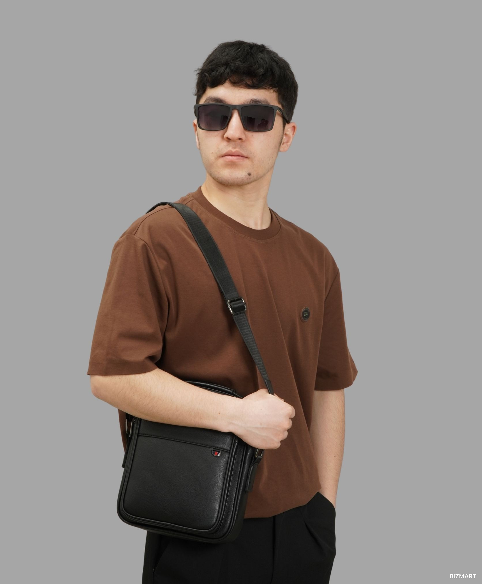 Минимализм и стиль в каждой детали — базовая футболка глубокого коричневого оттенка с лаконичным брендовым патчем на груди. Свободный крой и мягкая ткань обеспечивают комфорт в течение всего дня. Образ дополнен стильной чёрной сумкой через плечо и тёмными солнцезащитными очками, что придаёт образу современный городской акцент. Идеальный выбор для прогулок, встреч с друзьями или повседневных дел.