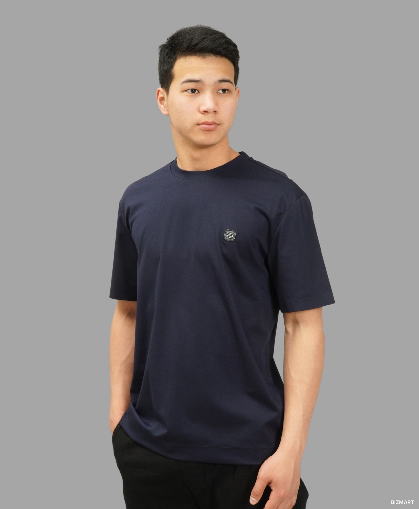 Этот лук — воплощение сдержанного комфорта с оттенком элегантности. Тёмно-синяя футболка свободного кроя — это альтернатива классическому чёрному, придающая образу глубину и свежесть. Небольшой акцент в виде логотипа на груди подчёркивает стиль без лишней вычурности.
