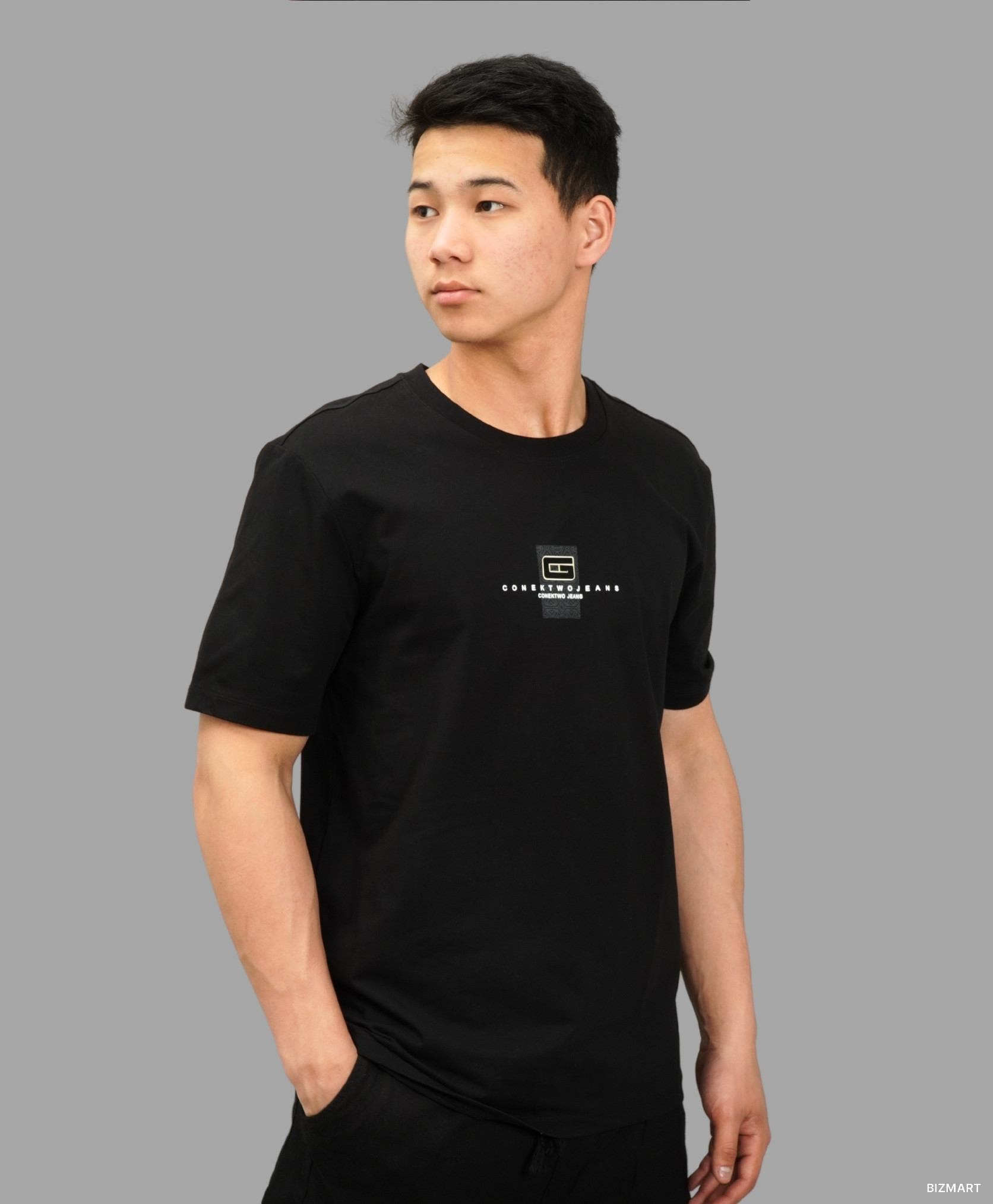 Базовая мужская футболка чёрного цвета — универсальный элемент гардероба. Лаконичный дизайн дополнен небольшим контрастным принтом с надписью "GORLEWOM JEANS" на груди. Прямой крой и мягкий хлопковый материал обеспечивают комфорт в течение всего дня. Отлично подойдёт для повседневной носки, прогулок или занятий спортом. Сочетается с любыми штанами, джинсами или шортами.