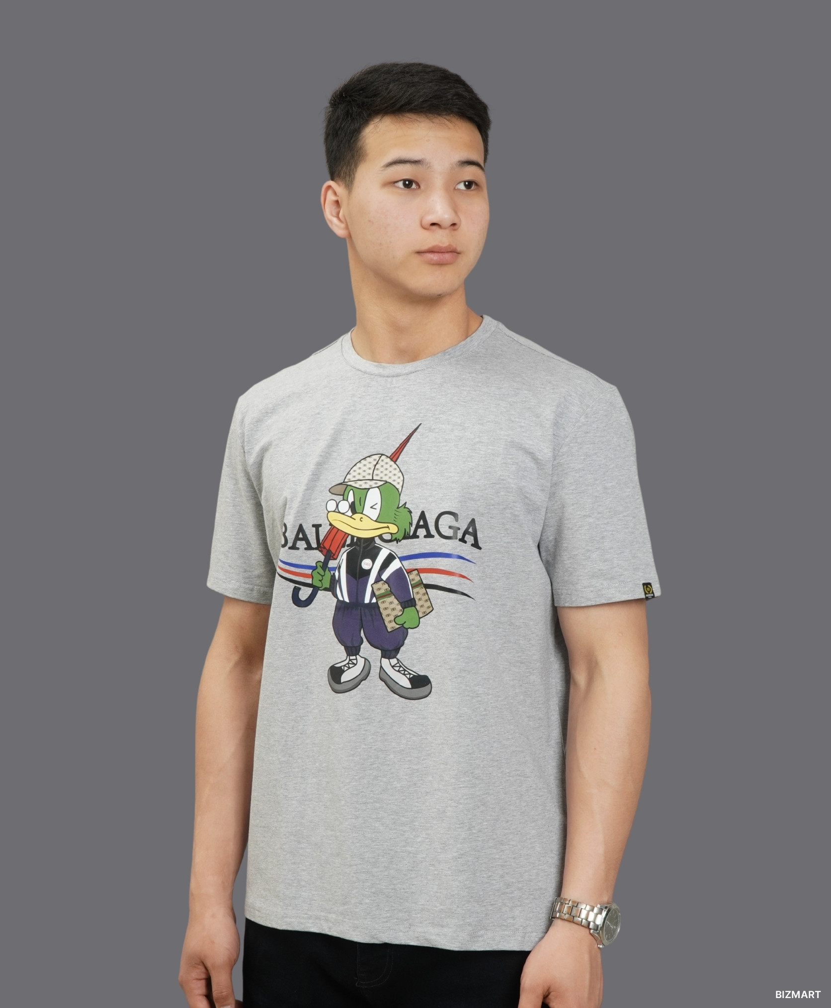 Добавьте яркости в повседневный гардероб с этой стильной мужской футболкой. Модель выполнена из качественного хлопкового трикотажа, который обеспечивает комфорт на весь день. На груди – оригинальный и забавный принт с мультяшным персонажем в спортивном образе и надписью "Balnaga", вдохновлённой популярными уличными брендами.