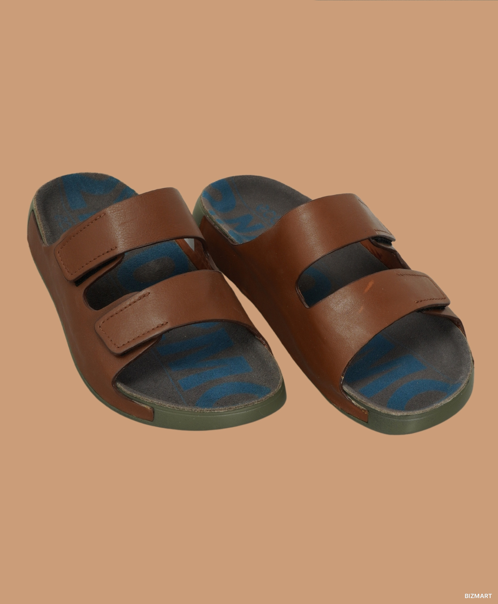 Эти шлёпанцы сочетают в себе удобство и стиль. Верх выполнен из гладкой коричневой кожи с двумя широкими ремешками на липучках, что позволяет индивидуально отрегулировать посадку. Стелька с графичным синим принтом и анатомической формой обеспечивает комфорт при каждом шаге. Идеальный вариант для повседневного летнего образа, отдыха на природе или городских прогулок.