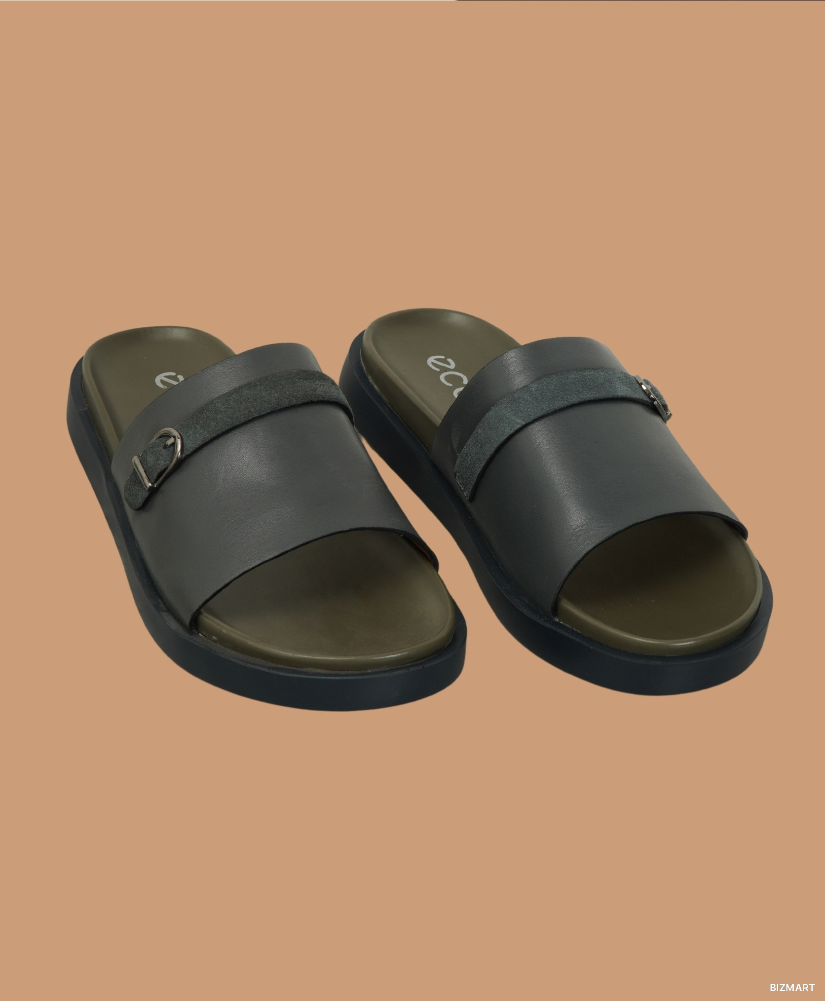 Современные и лаконичные шлепанцы от ECCO — идеальный выбор для летнего сезона. Выполнены из гладкой кожи глубокого серого цвета с мягкой внутренней стелькой оливкового оттенка. Элегантный акцент — ремешок с пряжкой, добавляющий стилю изысканности и индивидуальности. Удобная анатомическая подошва обеспечивает комфорт при длительной носке. Универсальная модель для отдыха, прогулок или повседневного образа в жаркие дни.