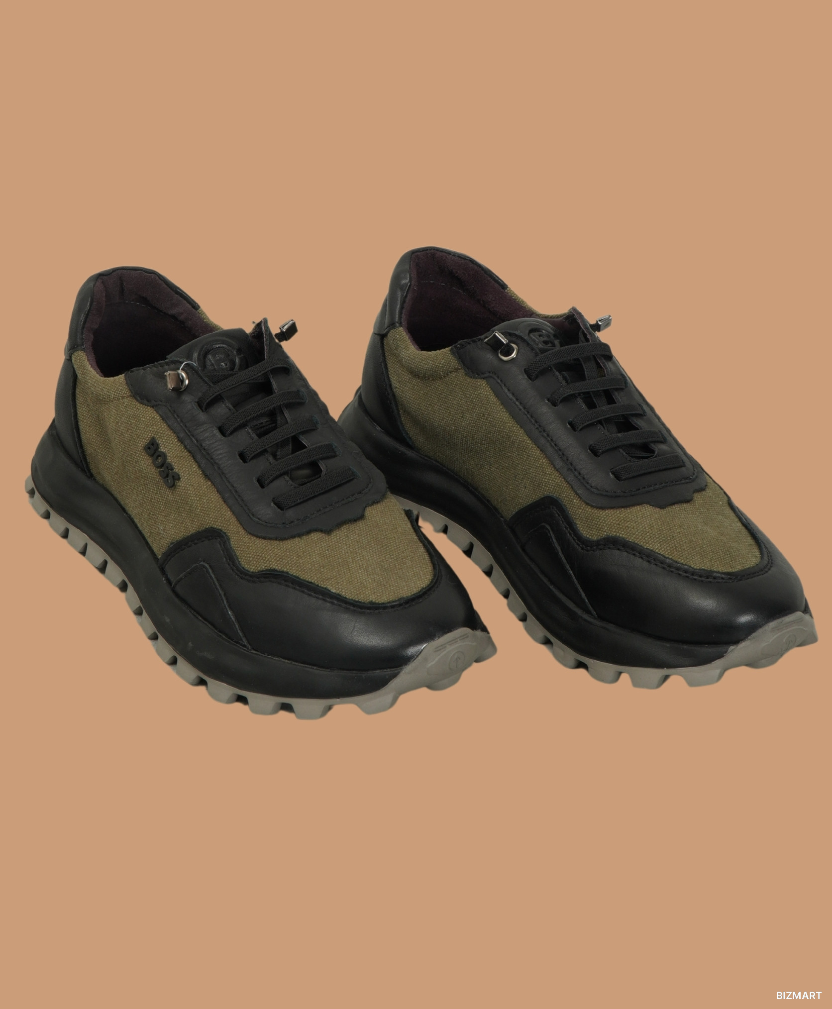 Эти стильные кроссовки от BOSS сочетают в себе текстиль цвета хаки и вставки из гладкой чёрной кожи, создавая эффектный контраст и современный образ в стиле милитари. Прочная резиновая подошва с агрессивным протектором обеспечивает отличное сцепление и устойчивость, делая модель подходящей не только для города, но и для активного отдыха. Удобная шнуровка и мягкая внутренняя отделка дарят комфорт на весь день. Универсальный вариант для смелого городского стиля.