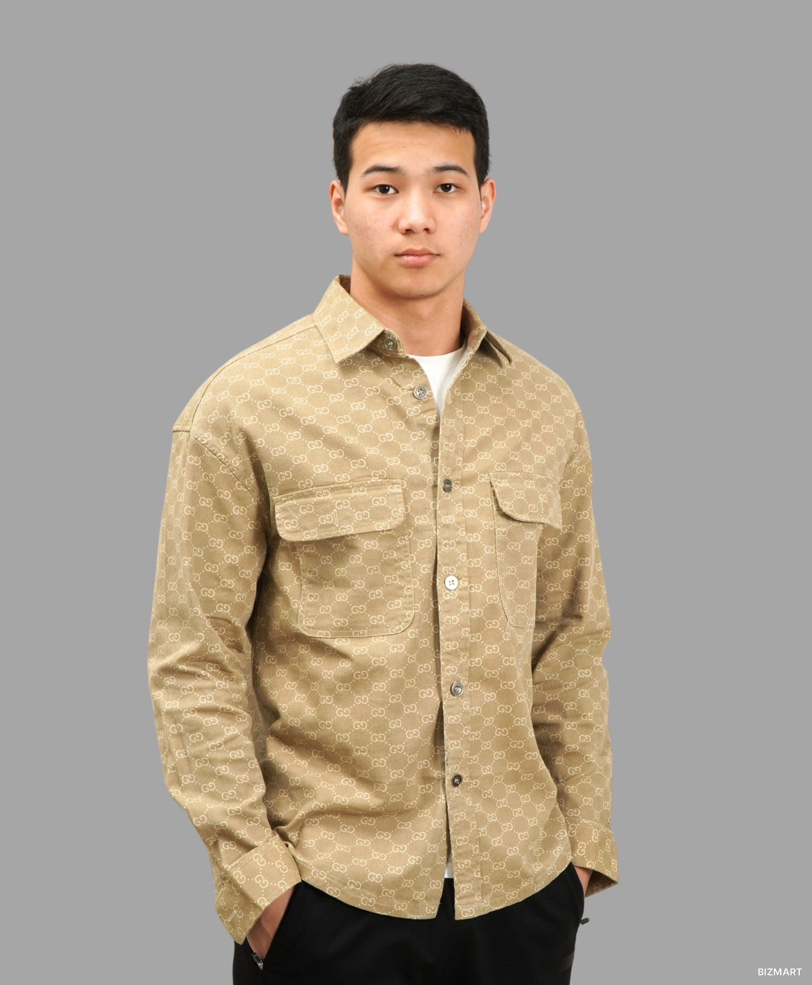 Мужская джинсовая рубашка  — элегантный выбор для стильного повседневного образа. Модель выполнена из плотного высококачественного денима с оригинальным геометрическим принтом в тёмных тонах. Два нагрудных кармана, один из которых украшен брендированной вставкой, добавляют образу акценты и функциональность. Контрастная прострочка подчёркивает премиальный крой и придаёт рубашке выразительность. Отлично сочетается с джинсами, брюками и шортами — универсальное решение в стиле casual с элементами люксовой эстетики.