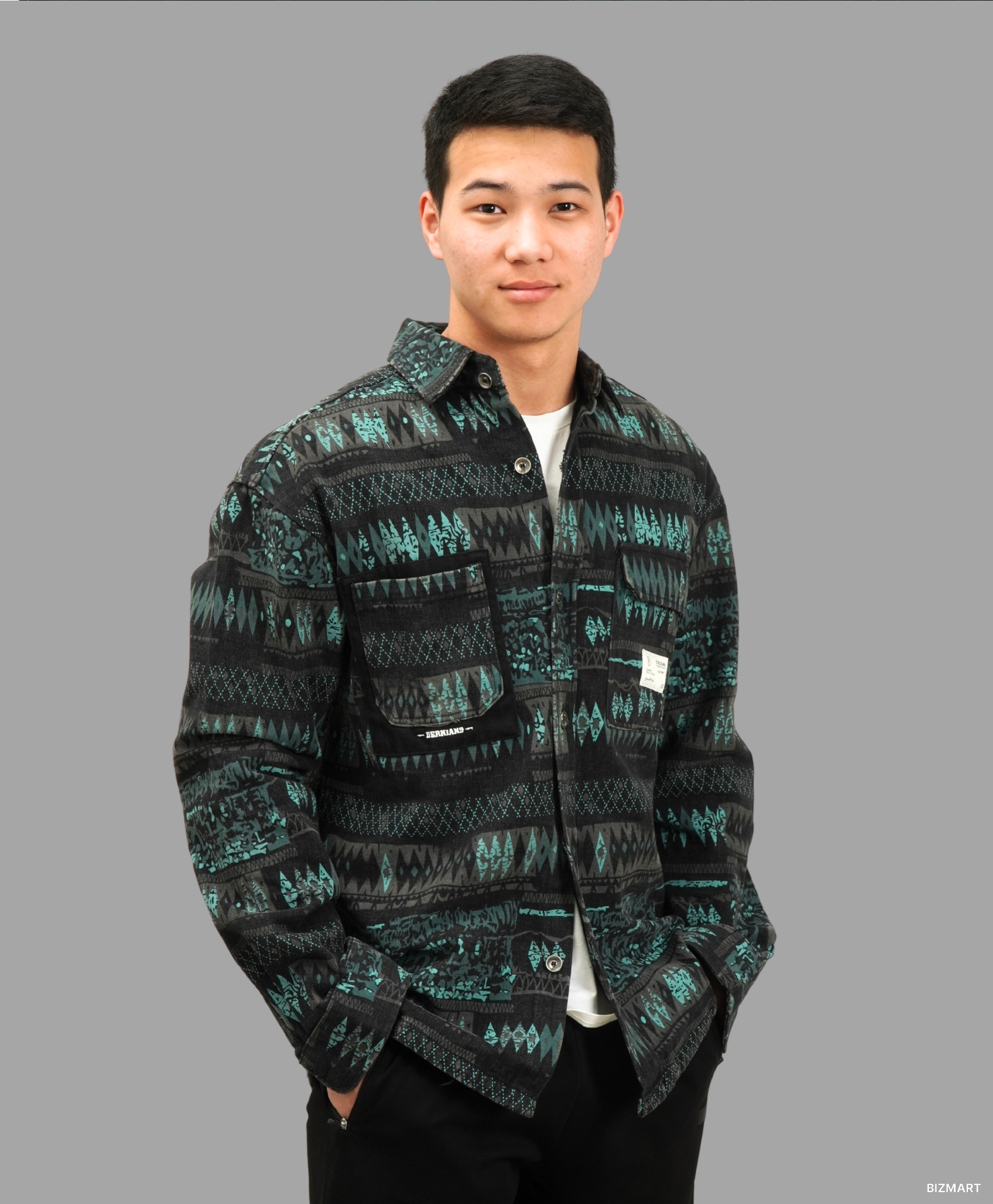 Мужская джинсовая рубашка  — стильное решение для повседневного гардероба. Модель выполнена из плотного денима с оригинальным геометрическим принтом в тёмных тонах. Два нагрудных кармана, один из которых украшен принтованной вставкой, придают образу акцент и функциональность. Контрастная прострочка подчёркивает детали кроя и добавляет изделию характер. Отлично сочетается как с джинсами, так и с брюками или шортами, создавая образ в стиле casual с ноткой брутальности.