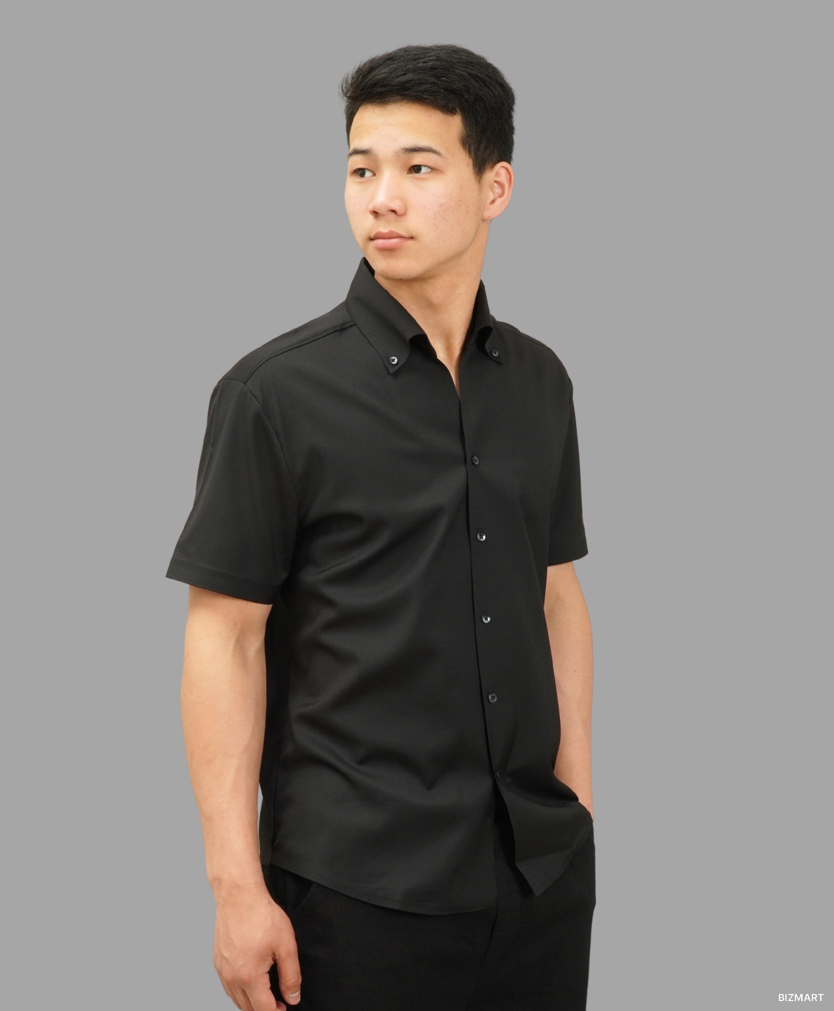 Эта чёрная рубашка с коротким рукавом — воплощение элегантной простоты. Благодаря гладкой фактуре ткани и аккуратному крою, она создаёт чистый, строгий образ без лишних деталей. Застёжка на пуговицах и воротник с потайными пуговицами добавляют немного формальности, делая её универсальной — от повседневного до делового стиля.