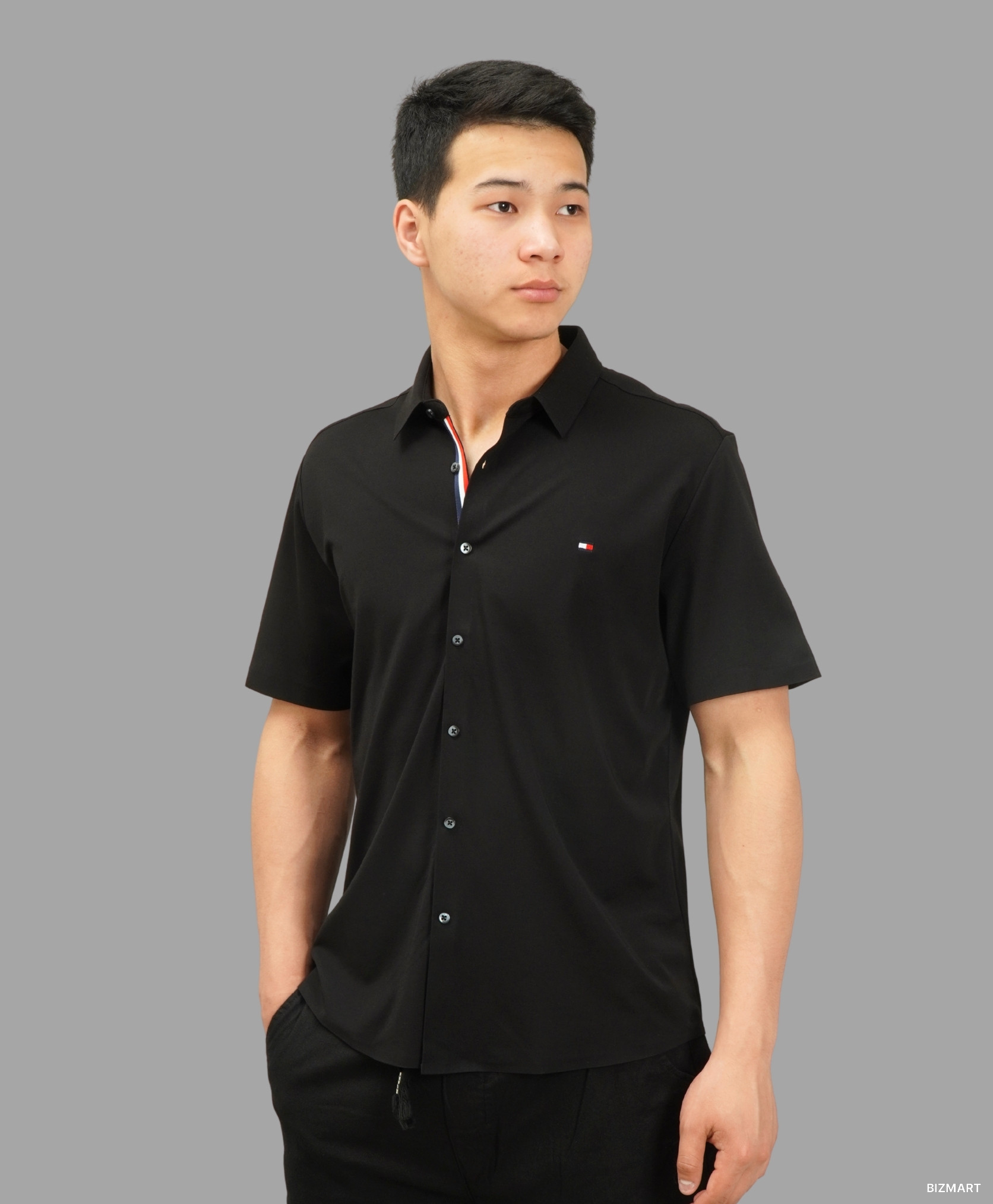 Современная чёрная рубашка прямого кроя с коротким рукавом — стильный выбор для повседневных образов и отдыха. Контрастная отделка внутри планки и миниатюрный декоративный элемент на груди придают модели оригинальность. Мягкая и эластичная ткань обеспечивает комфорт в носке.