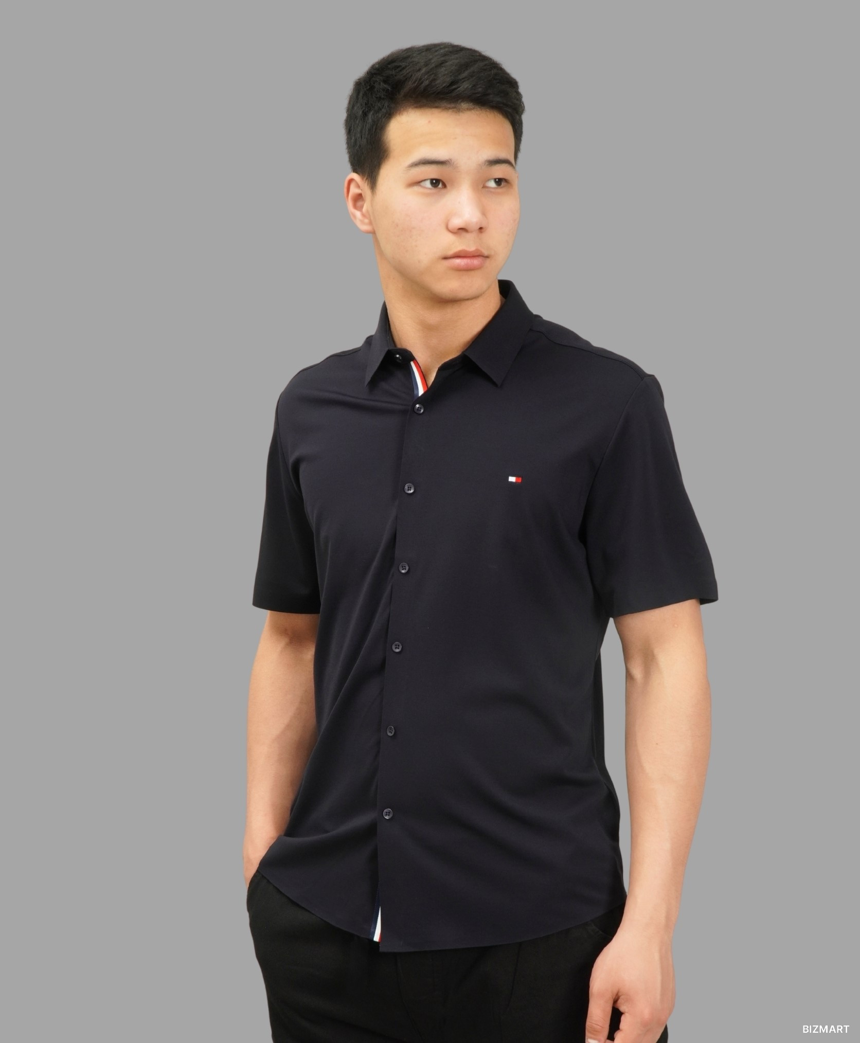 Минимализм и комфорт в одном образе — тёмно-синяя рубашка с коротким рукавом идеально подойдёт для повседневного стиля и неформальных встреч. Лаконичный крой подчёркивается небольшим логотипом на груди и аккуратной застёжкой на пуговицах, создавая современный и сдержанный образ.