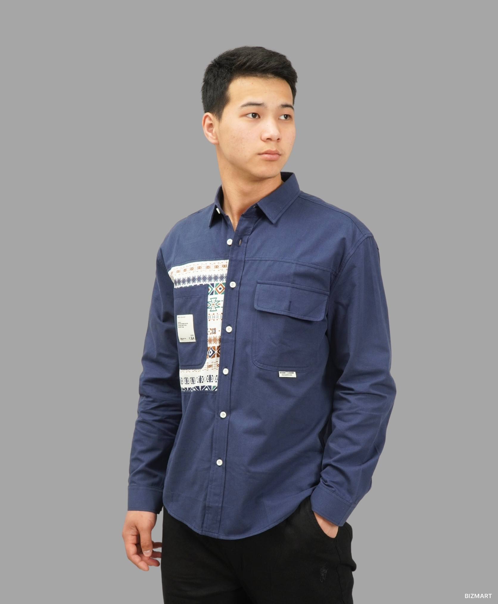 Мужская рубашка с длинным рукавом в насыщенном синем цвете — это смелое сочетание классики и креативного подхода. Этнический узор на груди привлекает внимание и делает образ уникальным, а удобный крой и качественный хлопковый материал обеспечивают комфорт в течение всего дня.