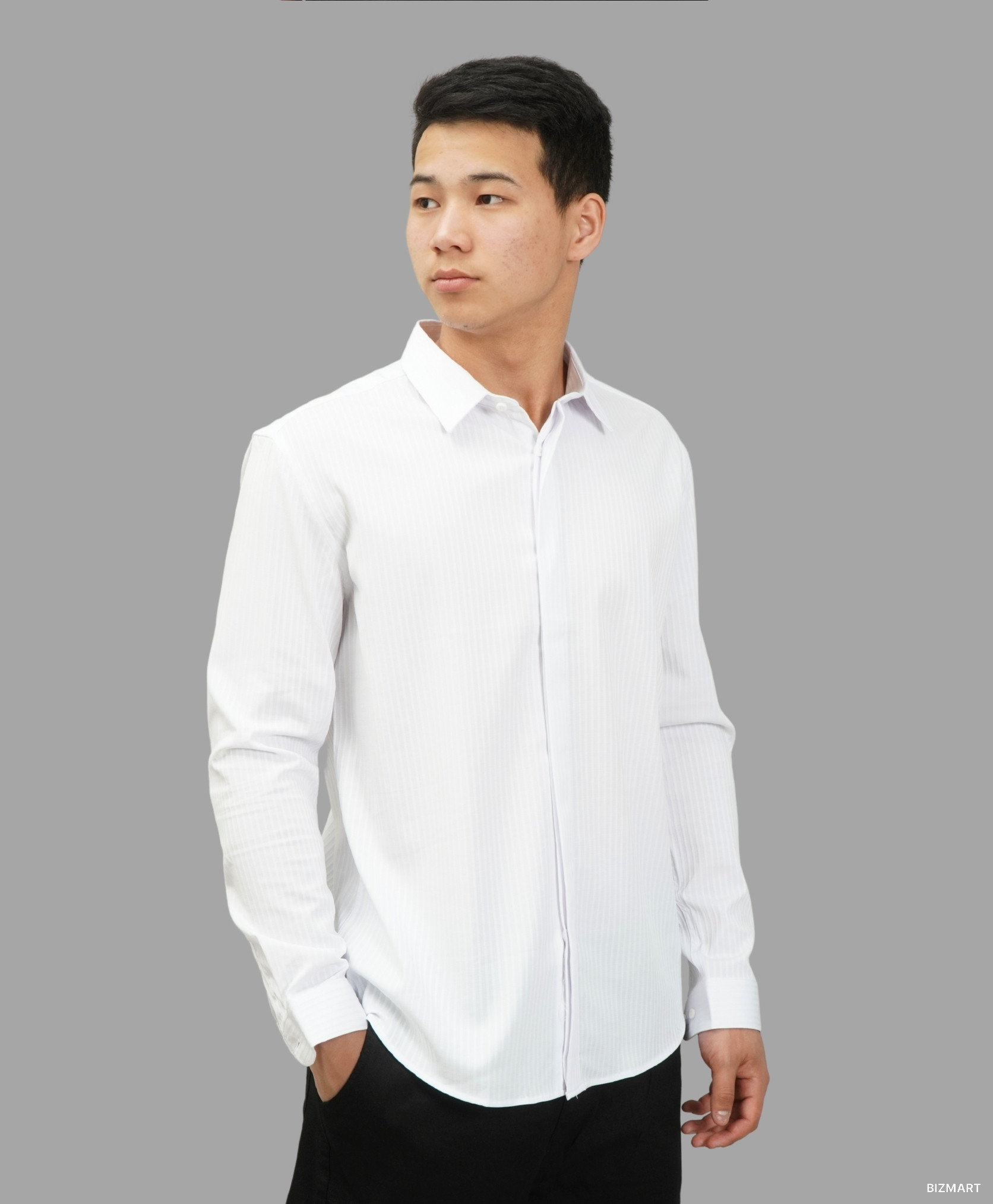 Стильная и универсальная рубашка прямого кроя — отличный выбор для офиса, деловых встреч или торжеств. Выполнена из приятной к телу ткани с легким полосатым рисунком, который придаёт образу изысканность. Классический воротник и скрытая застёжка на пуговицах делают модель особенно элегантной.
