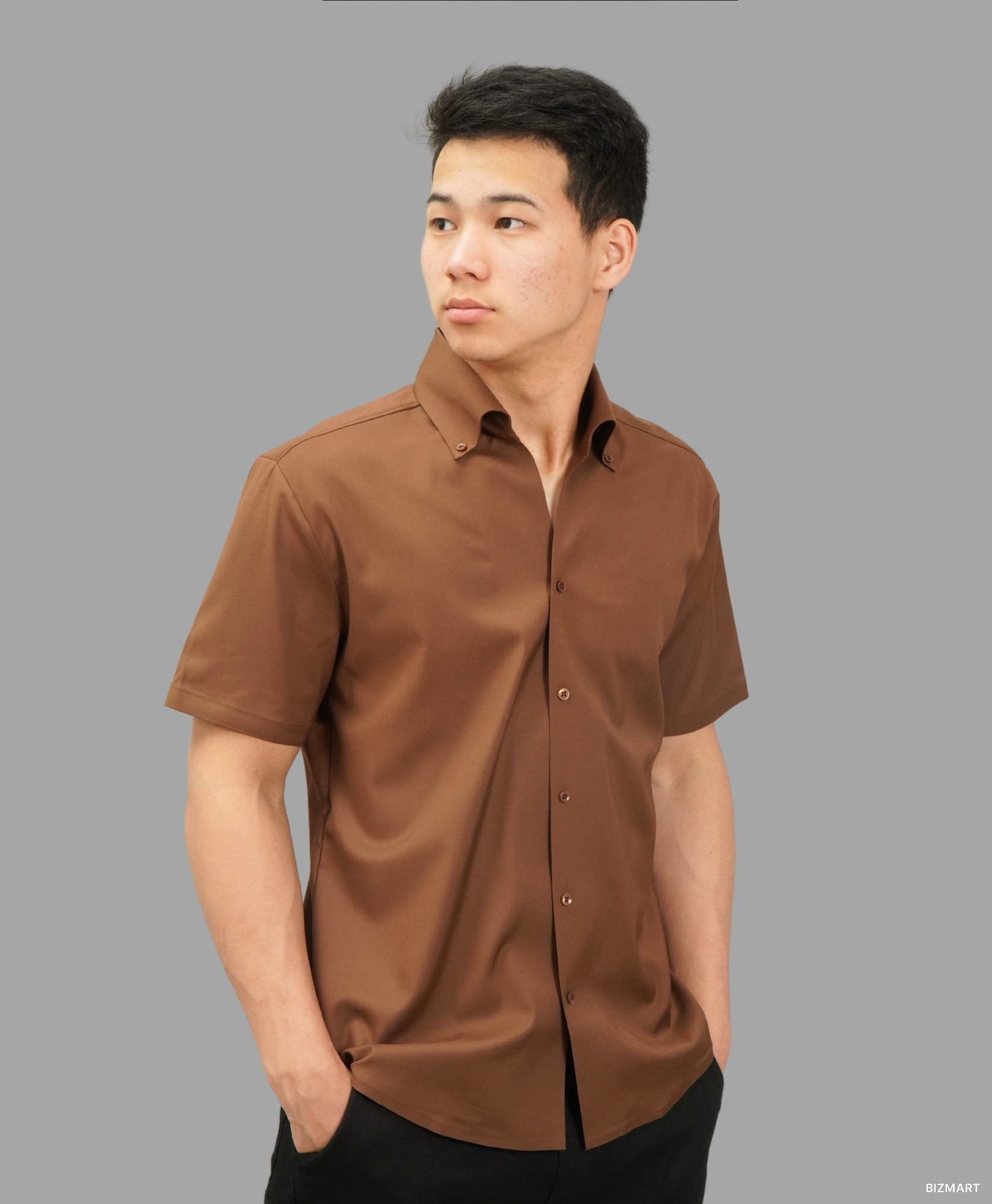 Рубашка мужская с коротким рукавом в коричневом цвете. Выполнена из мягкой и дышащей ткани, приятной к телу. Классический прямой крой обеспечивает комфорт и свободу движений. Универсальный стиль — подойдёт как для повседневной носки, так и для более строгих образов. Хорошо сочетается с брюками или джинсами.