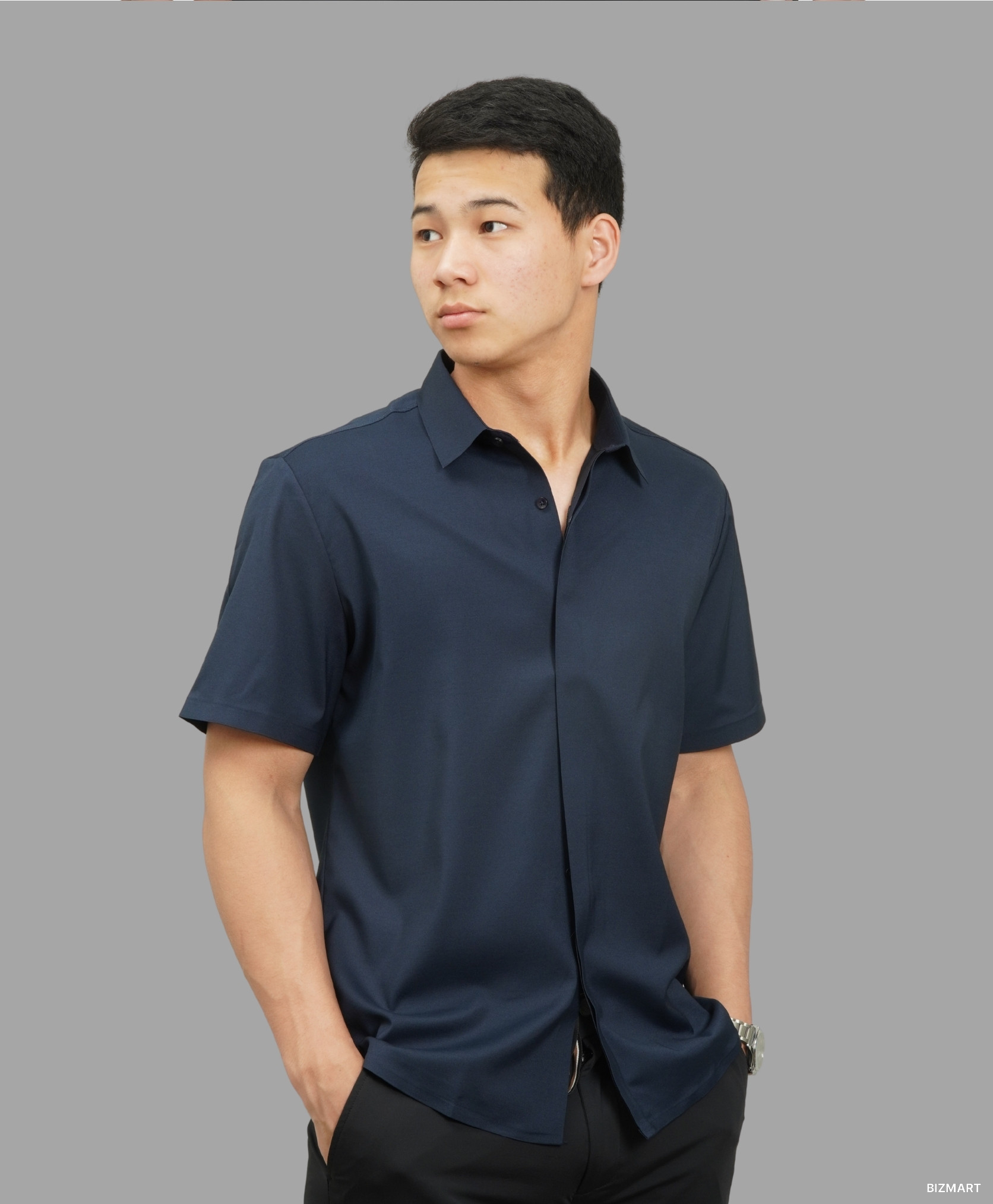 Эта тёмно-синяя рубашка с коротким рукавом — отличный выбор для тех, кто ценит сдержанную элегантность и универсальность. Глубокий оттенок синего добавляет образу интеллигентности и свежести, оставаясь при этом максимально практичным для повседневной носки.
