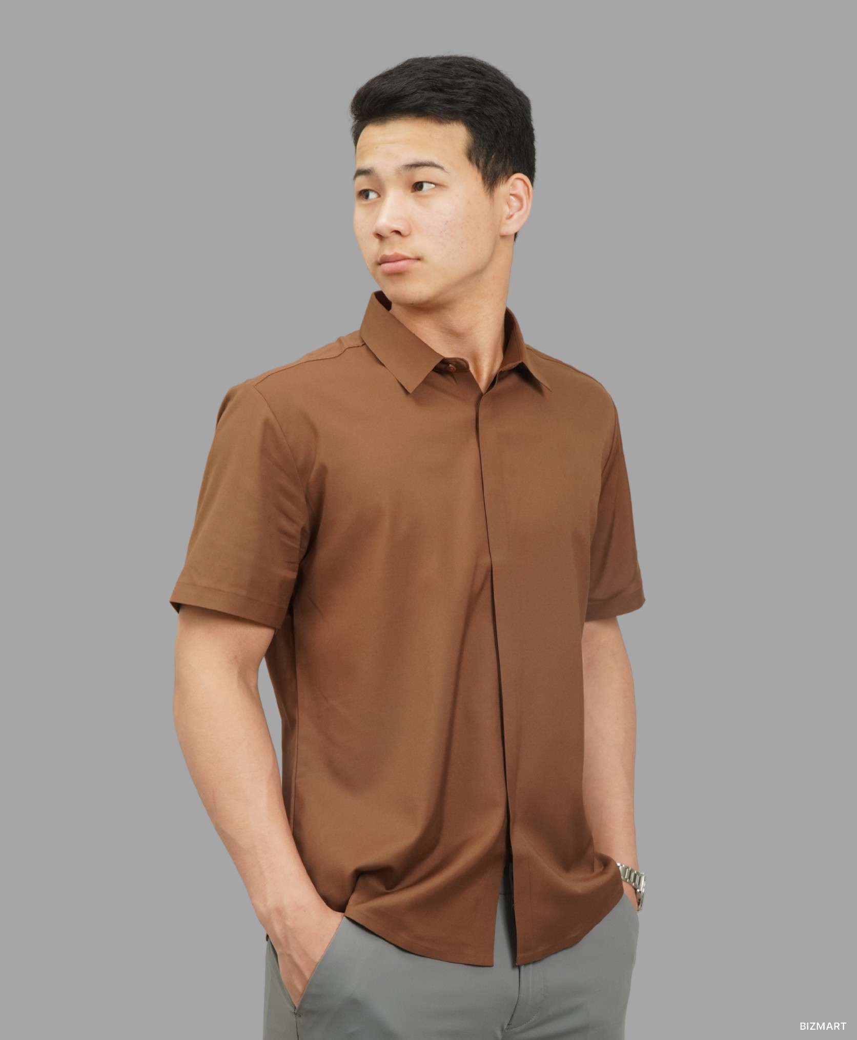 Элегантная и универсальная — эта коричневая рубашка с коротким рукавом идеально подойдёт как для офиса, так и для повседневных прогулок. Лаконичный дизайн без лишних деталей, скрытая застёжка и мягкий, приятный на ощупь материал делают её отличным выбором для жаркого сезона.