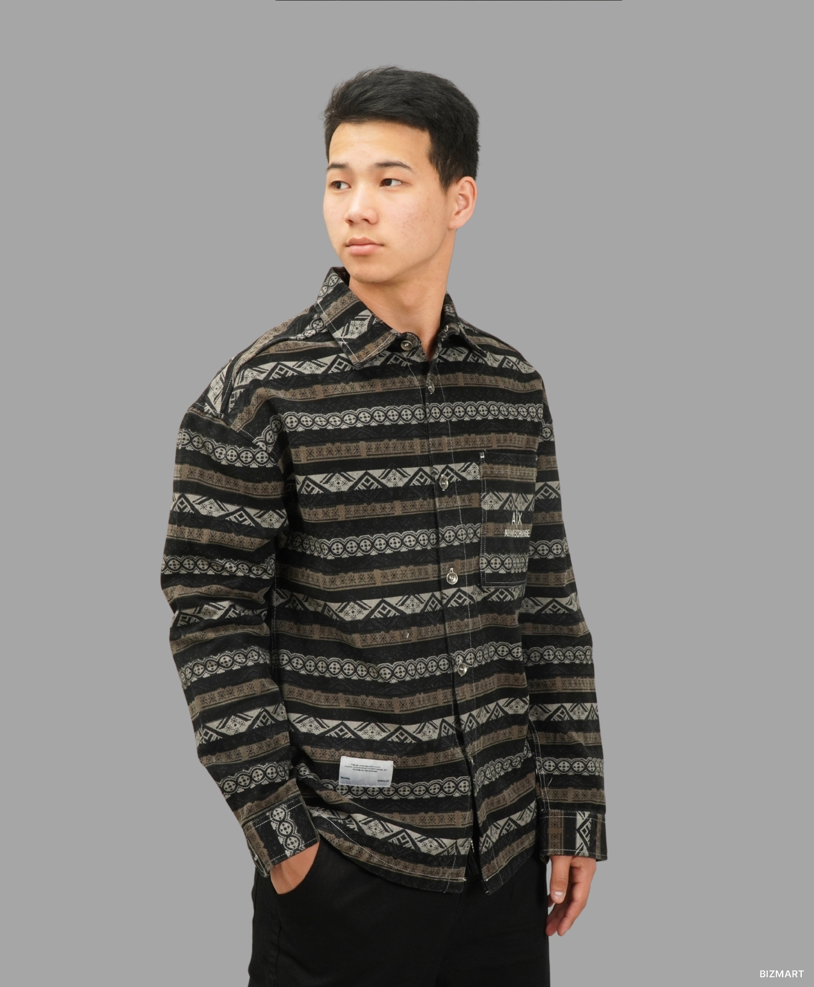 Мужская рубашка с длинным рукавом и этническим орнаментом — смелое решение для тех, кто хочет выделяться. Модель выполнена из плотной ткани, которая хорошо держит форму и сохраняет тепло, что делает её отличным вариантом для прохладной погоды. Геометрический принт придаёт образу характер и настроение уличного стиля с нотками бохо и винтажа.